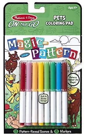 Magiczna kolorowanka z pisakiem Magic Pattern Colouring Pad Pets. Ta niesamowita kolorowanka pozwoli zająć dziecko na bardzo długo, posiada aż 15 stron do pokolorowania, każda z innymi zwierzętami: papugi, pieski, koty, konie tip. Kolorowe pisaki po zatknięciu się ze stroną kolorowanki ujawniają ukryte wzory na obrazkach. W zestawem znajduje się 8 pisaków umieszczonych w okładce kolorowanki, dzięki temu jest to świetny gadżet, by zająć czas dziecka np. w podróży.