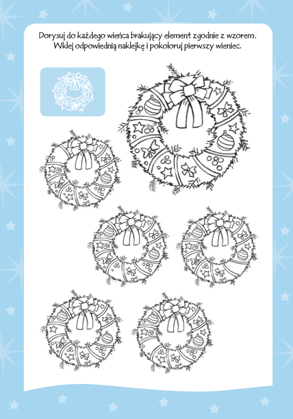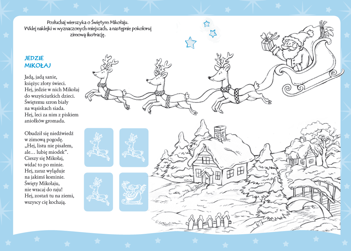 Rymowane zagadki i skoczne wierszyki niosą melodię Wigilii. Malowanki i naklejki, łamigłówki, labirynty i wyszukiwanki otula wciąż biały puch.