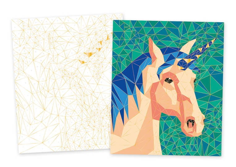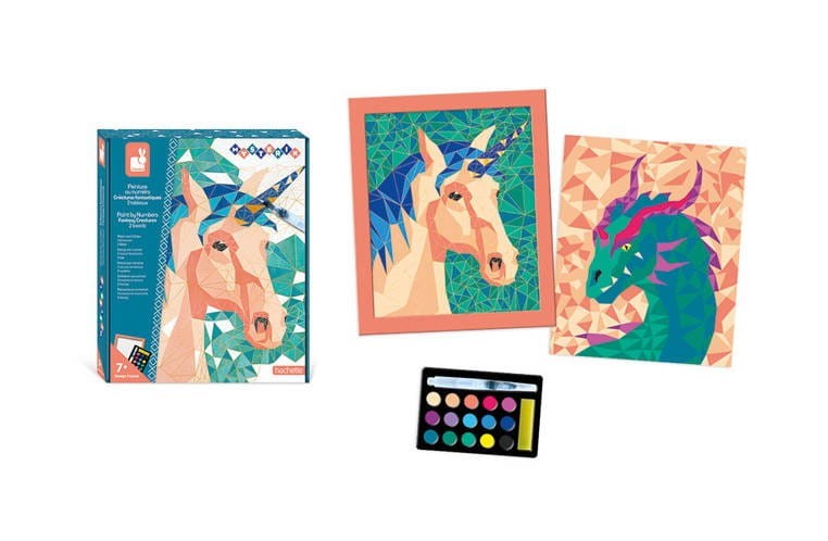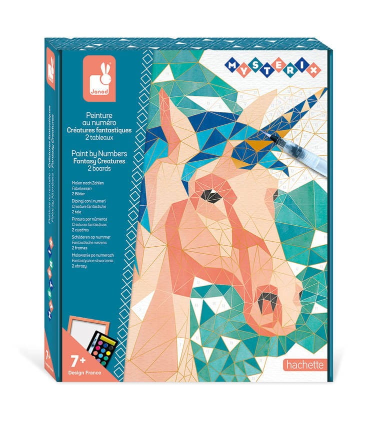 Kreatywna kolorowanka z numerkami Janod zawiera 2 plansze z ponumerowanymi polami, paletę z farbami oraz wodny pędzelek. Zadanie polega na malowaniu trójkątów zgodnie z instrukcją numeryczną, przy pomocy dołączonego specjalnego cienkiego pędzelka ze zbiornikiem wody. W palecie akwareli znajduje się 15 kolorów i mała gąbka do pochłaniania nadmiaru wody. W komplecie jest też ramka na skończony obrazek, którą również można pomalować na wybrany kolor.