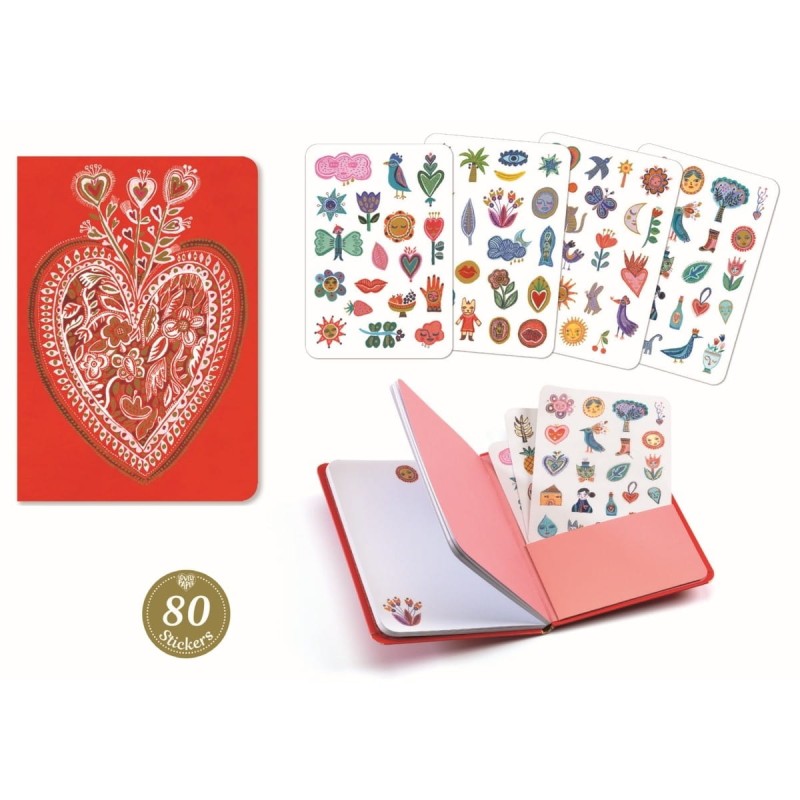 Kieszonkowy notesik Djeco w okładce ma umieszczone arkusze z połyskującymi naklejkami z leśnym i romantycznym motywem. Gładkie strony notesu mają delikatne ozdoby na górze. Czerwony notes z sercem posiada 78 stron to sporządzania notatek, rysunków, sekretnych zapisków oraz dekoracji z naklejek.