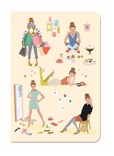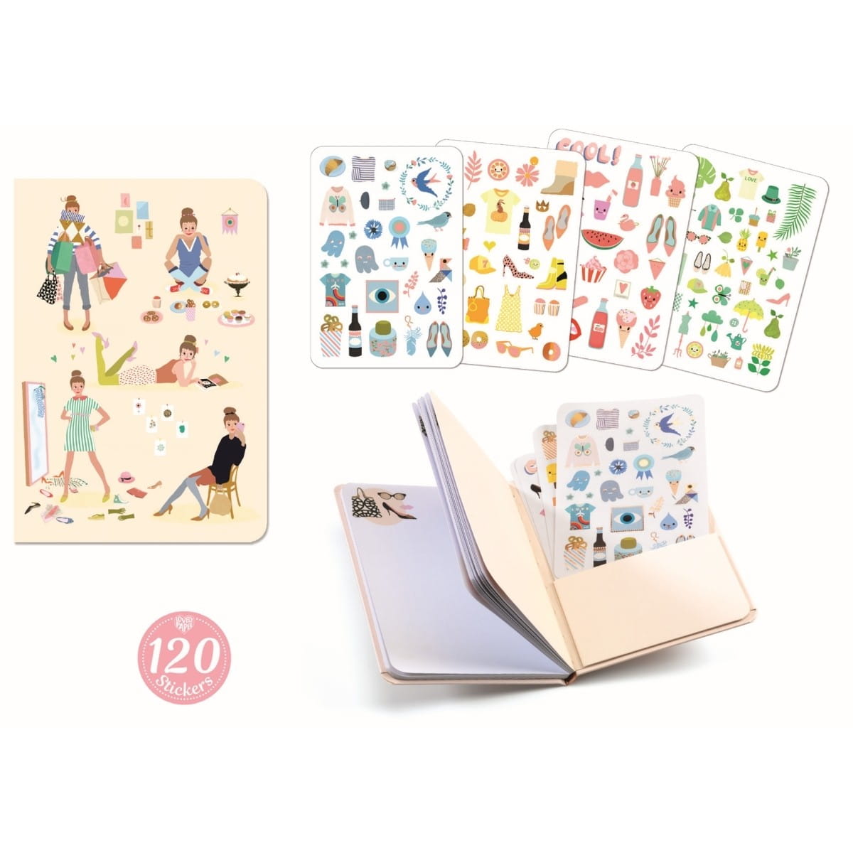 Kieszonkowy notesik Djeco w okładce ma umieszczone arkusze z połyskującymi naklejkami z ubraniami, owocami. Gładkie strony notesu mają delikatne ozdoby na górze. Piękny i subtelny notes posiada 78 stron to sporządzania notatek, rysunków, sekretnych zapisków oraz dekoracji z naklejek.