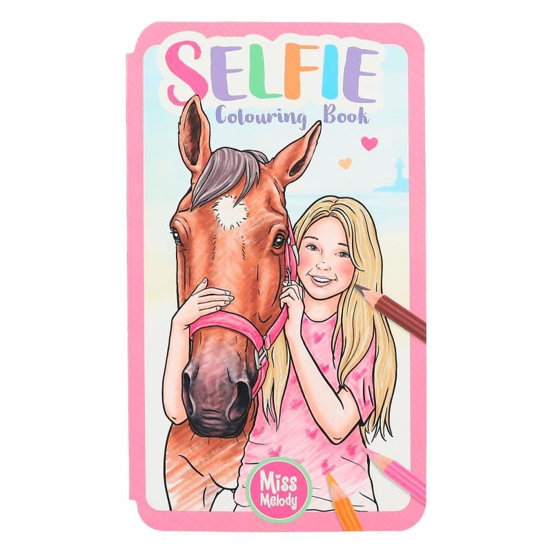 Uwaga na selfie! Mała książeczka do kolorowania w formacie telefonu komórkowego Miss Melody zawiera 30 wspaniałych kolorowanek z końmi i jeźdźcami i ich , z których niektóre wyglądają jak spontaniczne, zabawne zdjęcia typu selfie. W zestawie także: 35 uroczych naklejek.