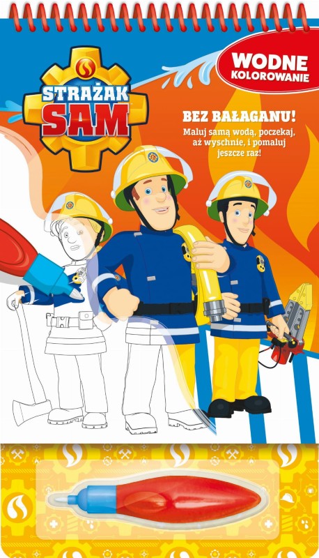 Wodna kolorowanka ze Strażakiem Samem. Kolorowanka z pisaki wodnym posiada 10 strony wielokrotnego użytku. Kolorowanie w podróży, w samolocie, w restauracji, w poczekalni... jest przyjemne, czyste i absorbujące. Pisak napełnia się wodą, zakręca szczelnie i maluje po stronach książeczki. Od razu ujrzymy ukryte obrazki, które znów wyschną po około 15 min i obraz zniknie - i tak malujemy od nowa. Wodny marker lekko sunie po stronach kolorowanki. Kolory są żywe, obrazki estetyczne, pisak chowa się w okładce i nie zgubi.