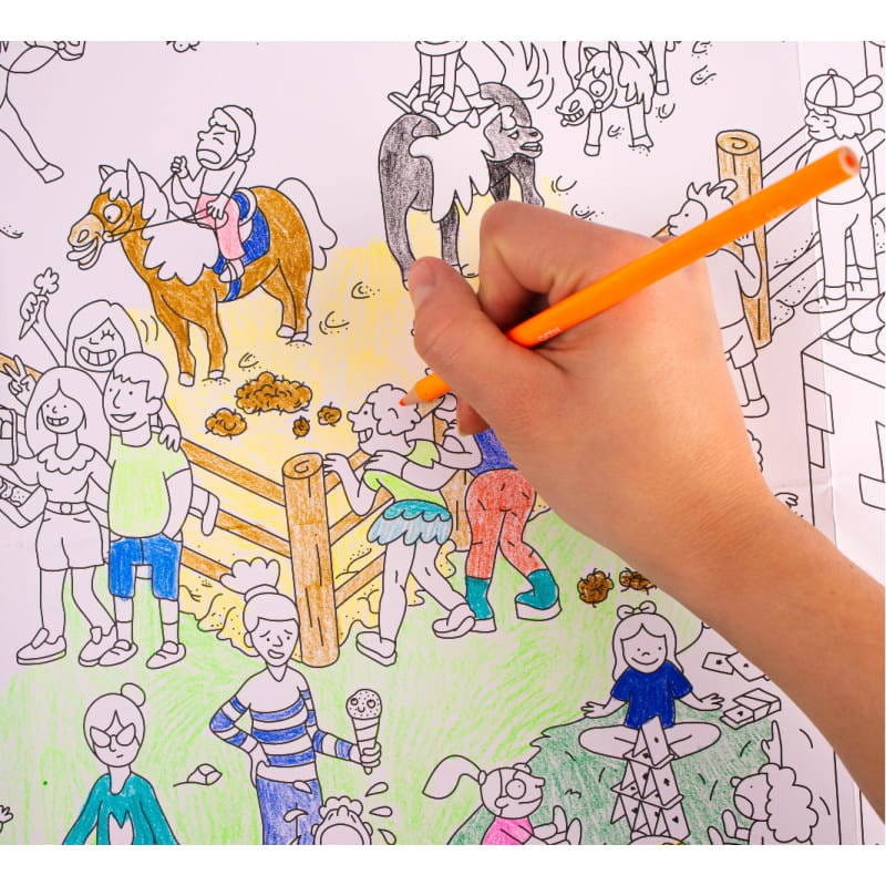 Dzięki wielkiemu formatowi, pokolorowana makieta może stać się scenerią do wielu dziecięcych zabaw. Koloruj, śledź przygody w klubie pony i opowiadaj o nich.