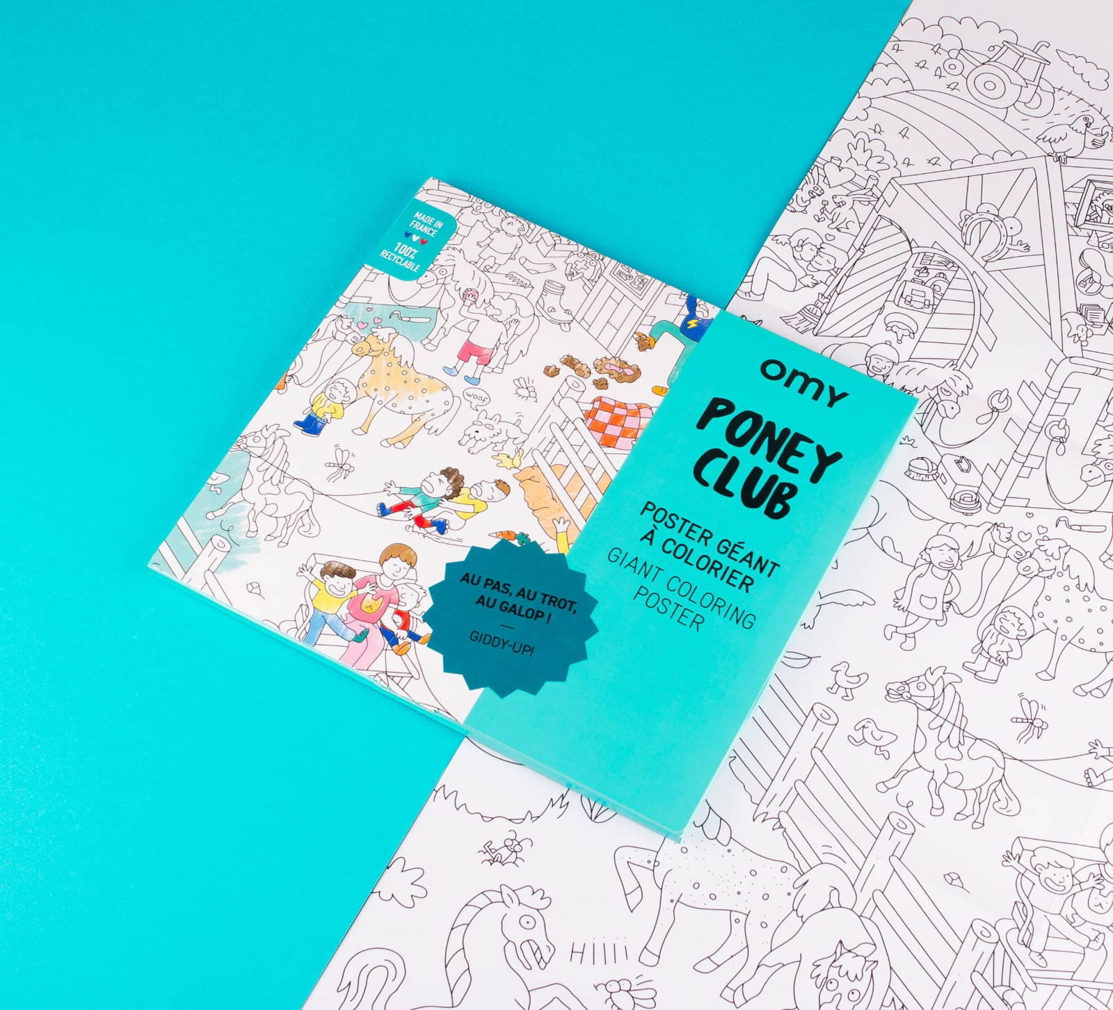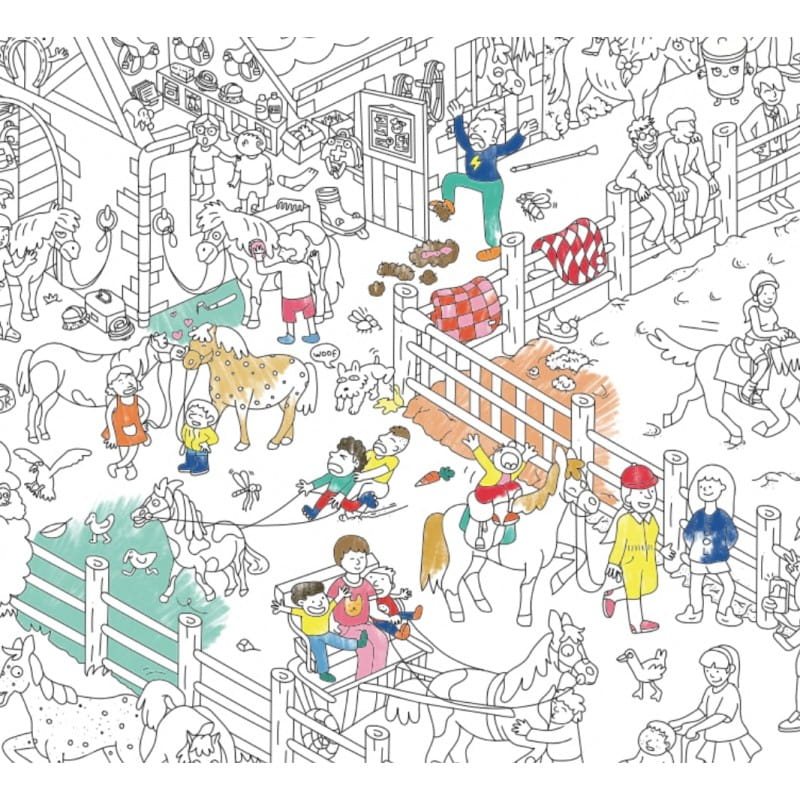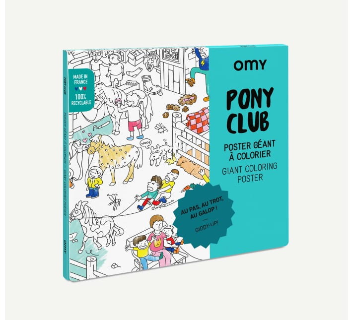 Pony Club plakat to duża podłogowa kolorowanka, którą można zawiesić na ścianę. Gigantyczny plakat do kolorowania przedstawia klub jeździecki i wiele przygód, które dzieją się w stajni, na parkurze i padoku.