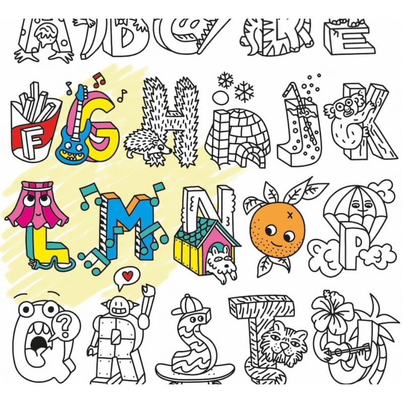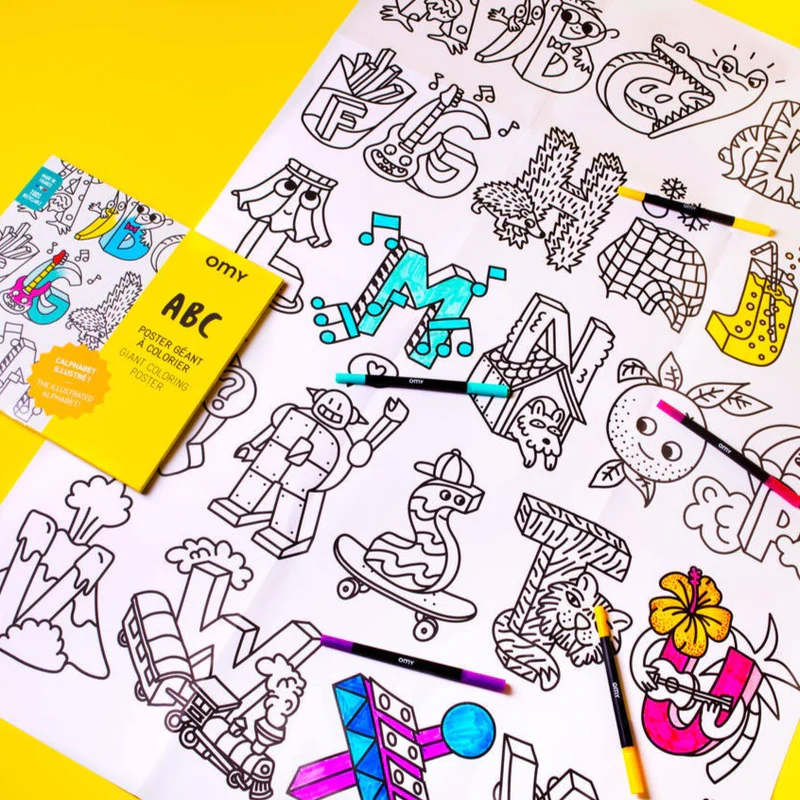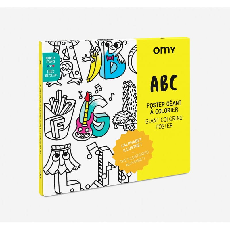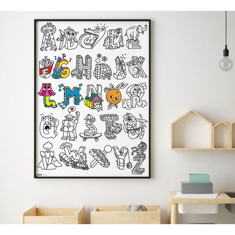 ABC - POSTER to duża podłogowa kolorowanka, którą można zawiesić na ścianę. Gigantyczny plakat do kolorowania przedstawia alfabet z obrazkami w języku angielskim: A - Acrobat , B - Banana, C - Crocodile. D