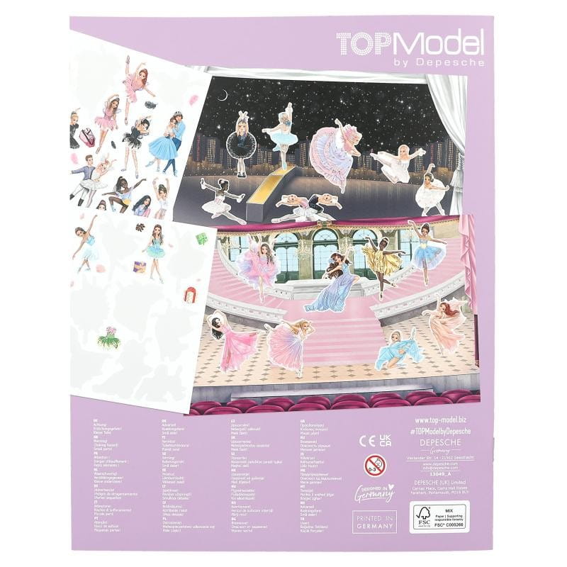Album z naklejkami Ballet Top Model Stickerworld to kreatywny zestaw z 116 naklejkami, w którym aranżujemy życie tancerek. Kreatywna książeczka w dużym formacie posiada strony z różnymi tłami, sceną, garderobą, salą do treningów, pięknymi salami do tańca oraz jest wypełniona naklejkami z bagnicami. Naklejki z tancerkami klasycznymi TopModel są śliskie, z brokatem, połyskują i pięknie się mienią.