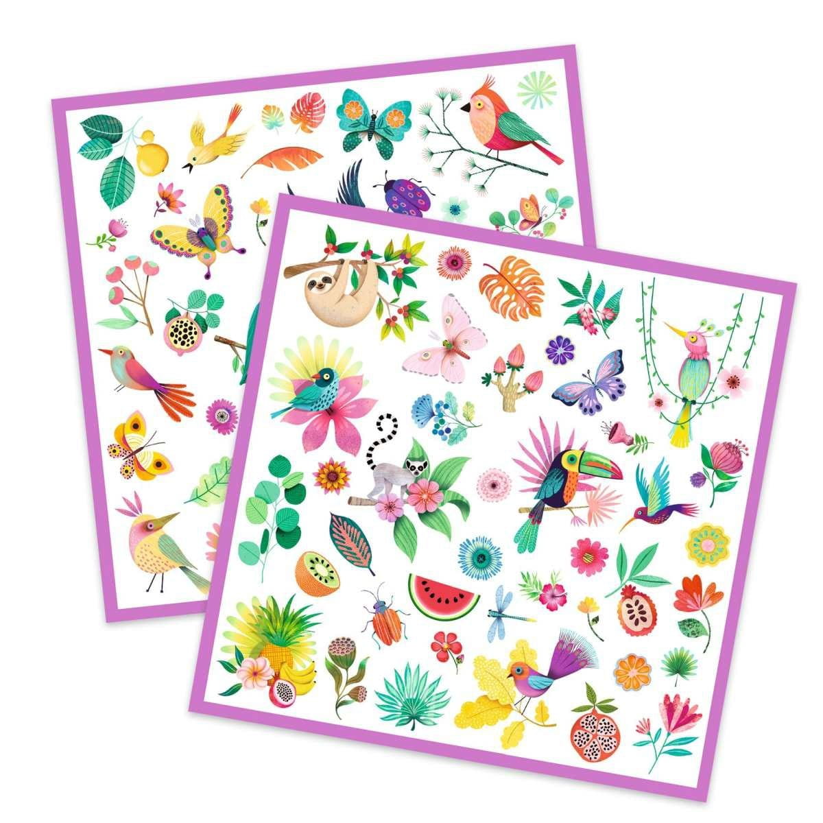 Zestaw naklejek Djeco z motywem rajskim, a w niej aż 160 naklejek z kwiatami, ptakami, egzotycznymi owocami.