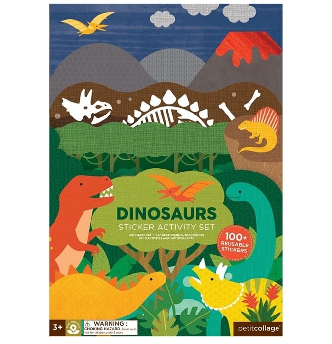 Kreatywny zestaw naklejek Petit Collage to dwustronna plansza z krajobrazem oraz mnóstwo naklejek wielokrotnego użytku. Wielorazowe naklejki z dinozaurami, roślinnością, szkieletami i śladami przykleja się na kolorowe tło tworząc własną scenerię. Niektóre miejsca są podpowiedzią, gdzie przykleić naklejkę.