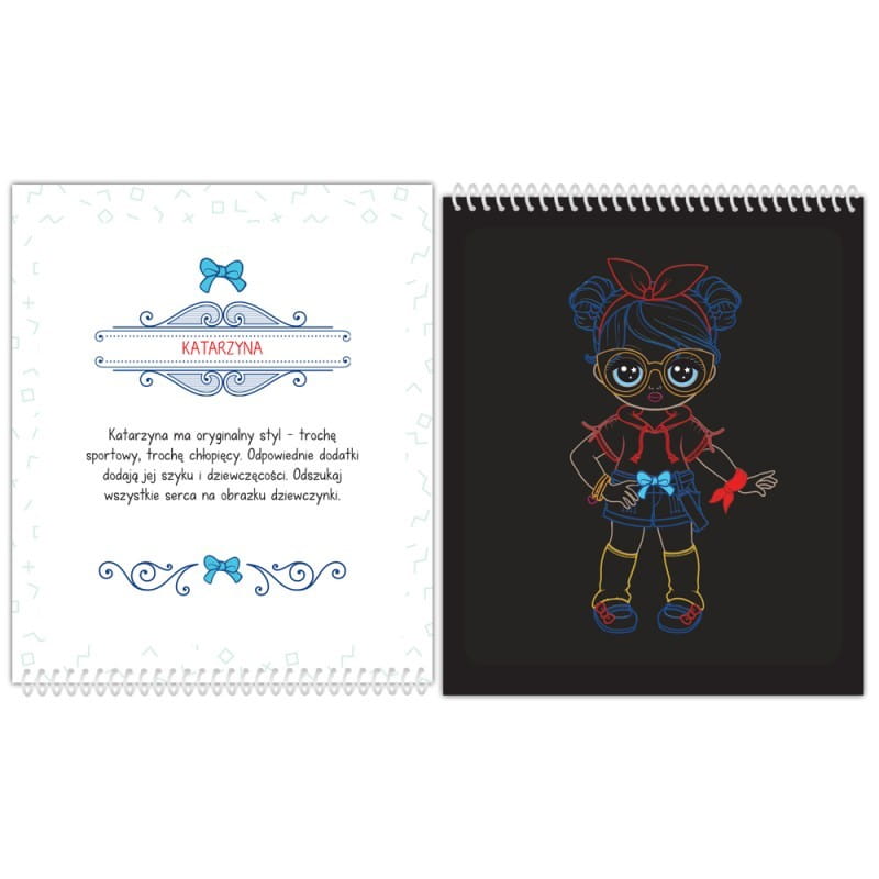 Świat małych elegantek - kolorowy i wesoły. Notes na kołowrotku jest pełen arkuszy wydrapywanek z dziewczynkami oraz krótkimi historyjkami z zagadką. Czarne karty zdrapki kryją pod spodem kreatywne obrazy do zdrapania. Zadanie polega na zdrapaniu wosku załączonym rysikiem z zaznaczonych miejsc na kartach. Stopniowo odsłoni się kolorowe tło. Zdrapywanki są kolorowe, błyszczące i stanowią piękną ozdobę.