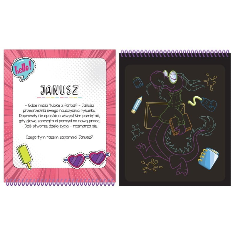 Świat smoków - kolorowy i wesoły. Notes na kołowrotku jest pełen arkuszy wydrapywanek ze smoczymi obrazkami oraz krótkimi historyjkami z zagadką. Czarne karty zdrapki kryją pod spodem kreatywne obrazy do zdrapania. Zadanie polega na zdrapaniu wosku załączonym rysikiem z zaznaczonych miejsc na kartach. Stopniowo odsłoni się kolorowe tło. Zdrapywanki są kolorowe, błyszczące i stanowią piękną ozdobę.