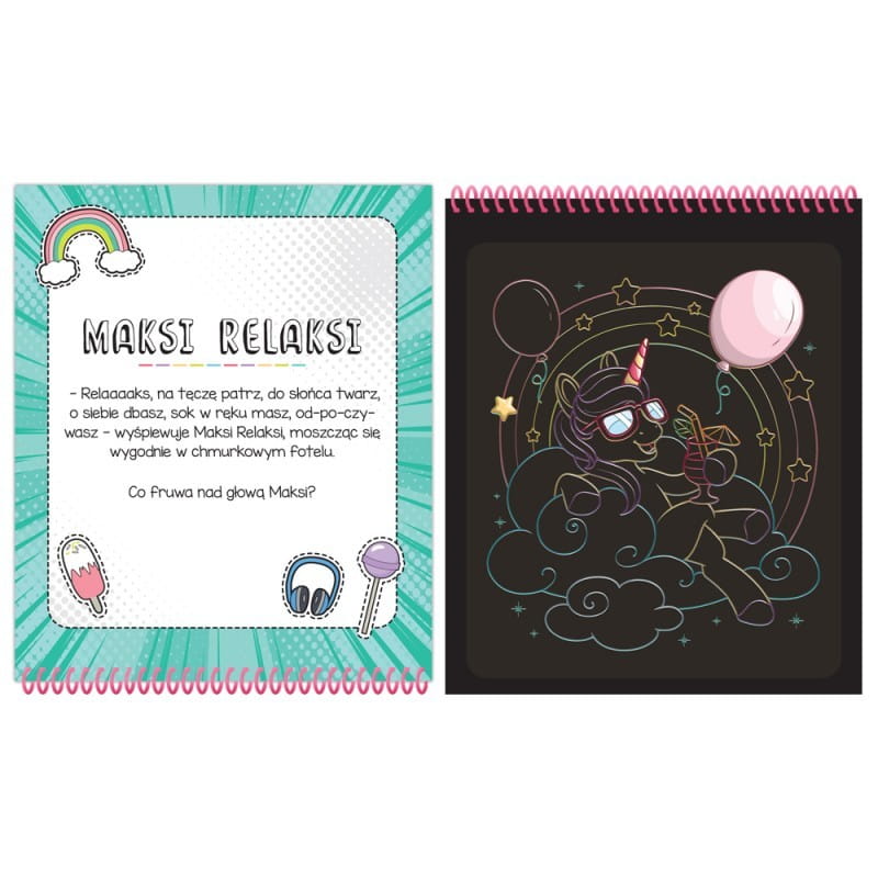 Świat jednorożców - kolorowy i wesoły. Notes na kołowrotku jest pełen arkuszy wydrapywanek z jednorożcami oraz krótkimi historyjkami z zagadką. Czarne karty zdrapki kryją pod spodem kreatywne obrazy do zdrapania. Zadanie polega na zdrapaniu wosku załączonym rysikiem z zaznaczonych miejsc na kartach. Stopniowo odsłoni się kolorowe tło. Zdrapywanki są kolorowe, błyszczące i stanowią piękną ozdobę.