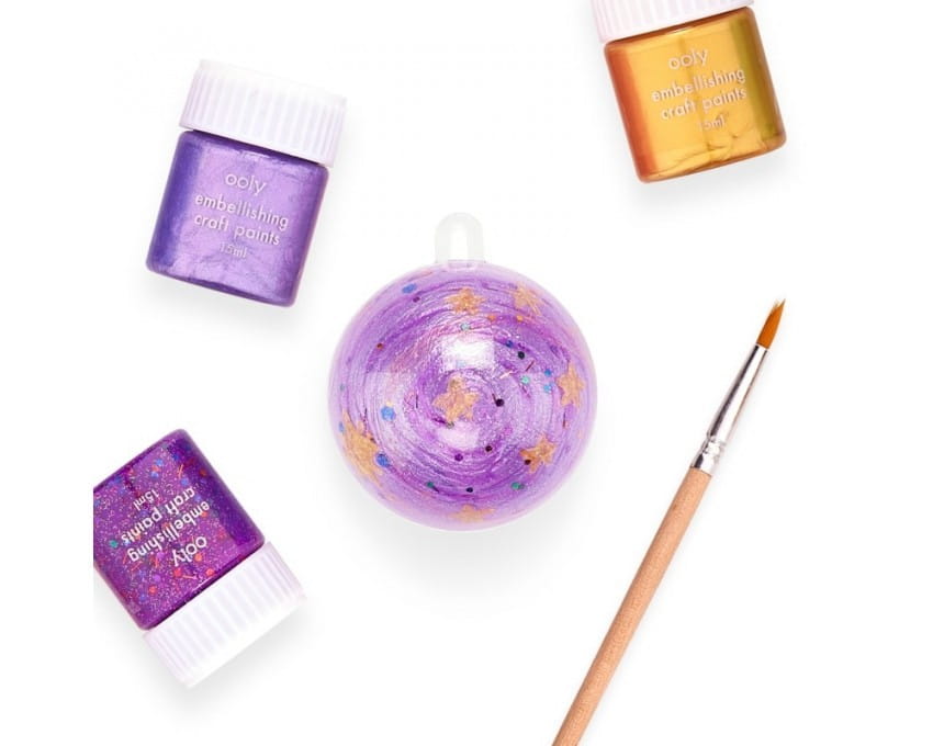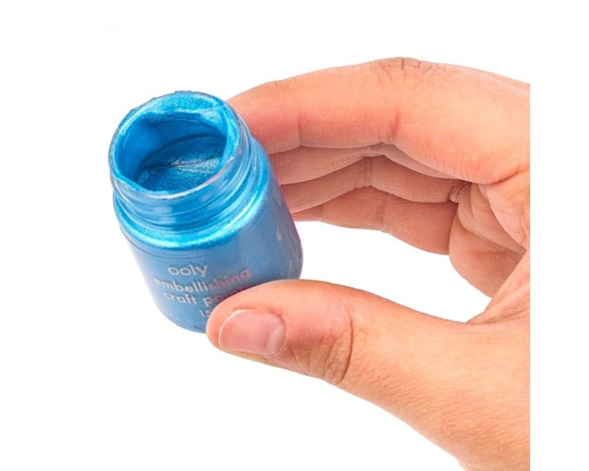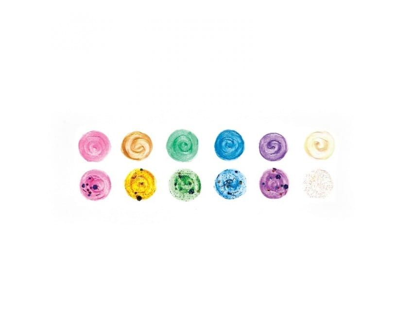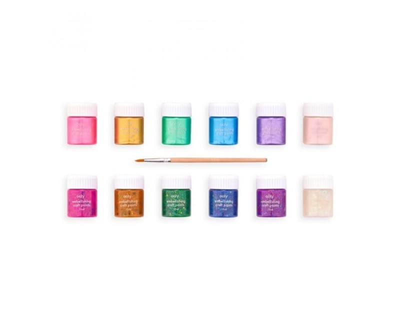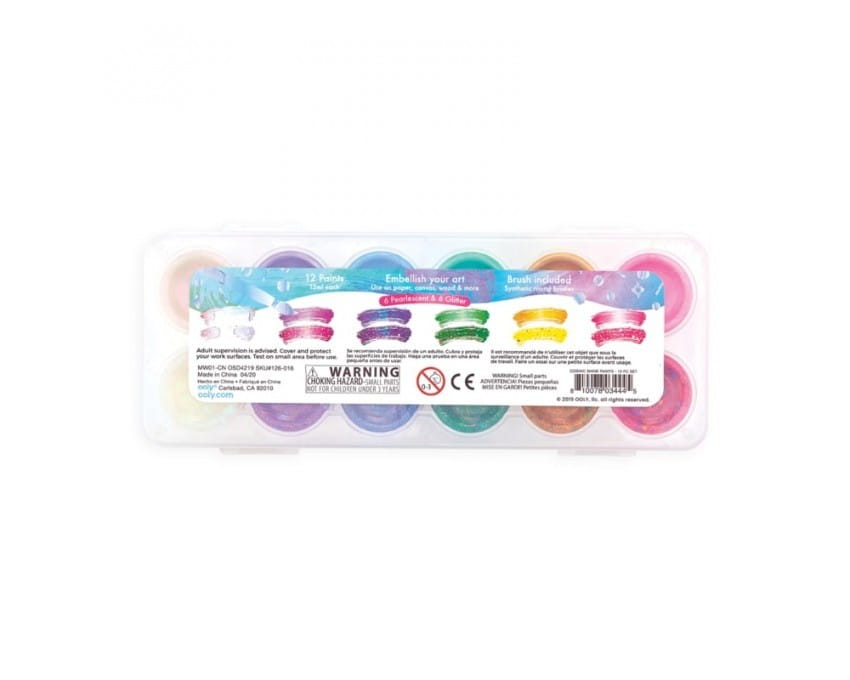 Śliniące, perłowe farby i z brokatem Ooly dodadzą magii każdemu obrazowi. Teraz możemy decydować, czy malujemy farbą perłową, czy też z brokatem, a nawet obiema dla lepszego efektu. Magiczne farby ozdobią nie tylko kartkę papieru, ale mogą udekorować różne powierzchnie, także czarne tła. Zestaw farb akrylowych w słoiczkach liczy 6 brokatowych kolorów i 6 perłowych kolorów oraz pędzelek.