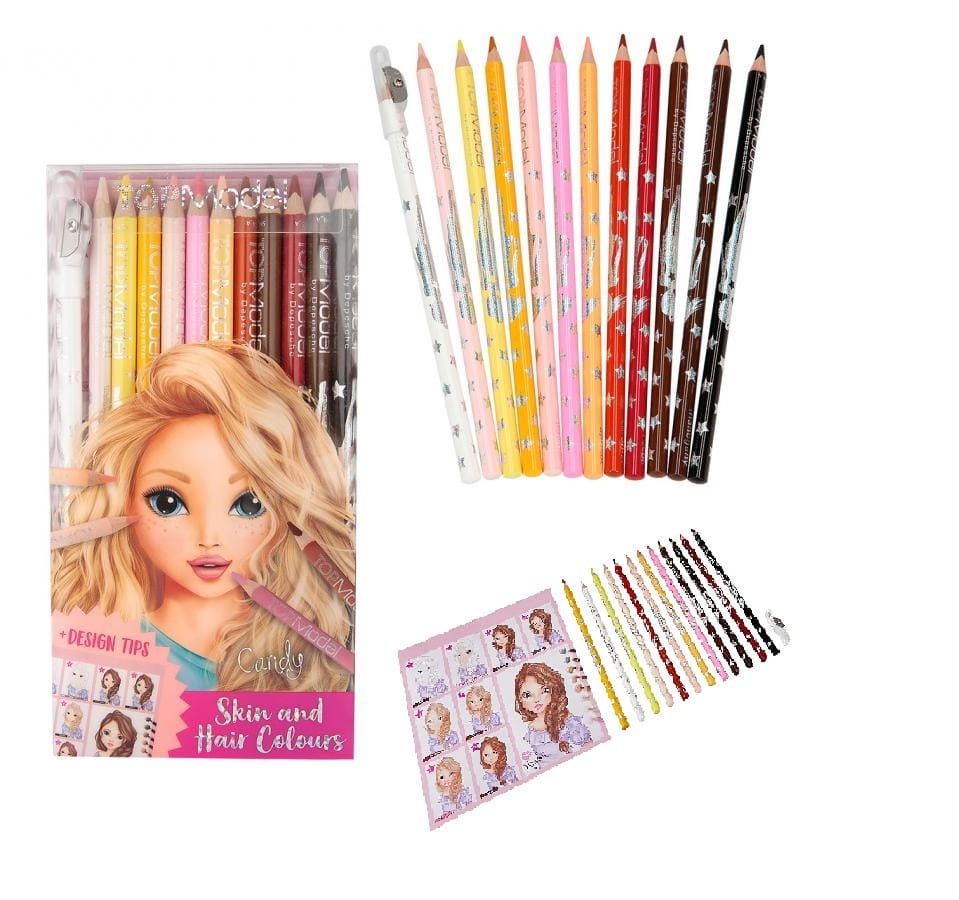 Kredki w odcieniach karnacji skóry oraz włosów świetnie wzbogacą tradycyjny zestaw kredek. Zestaw Skin And Hair Colours to ołówkowe kredki we wszystkich odcieniach skóry i włosów. Dzięki nim projekty mody i kolorowanki nabiorą bardzo realnego wyglądu. Kredki TOPModel z temperówką do ostrzenia oraz instrukcją podpowiedziami, jak malować.