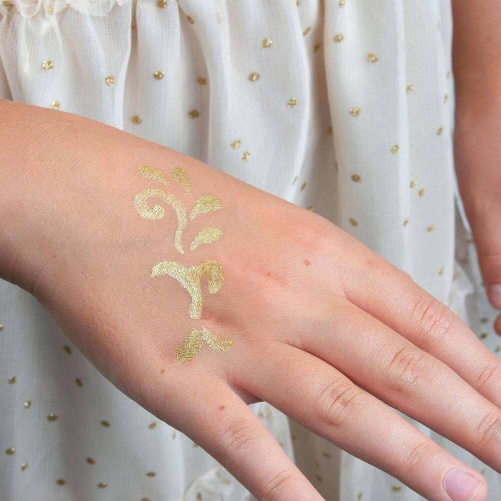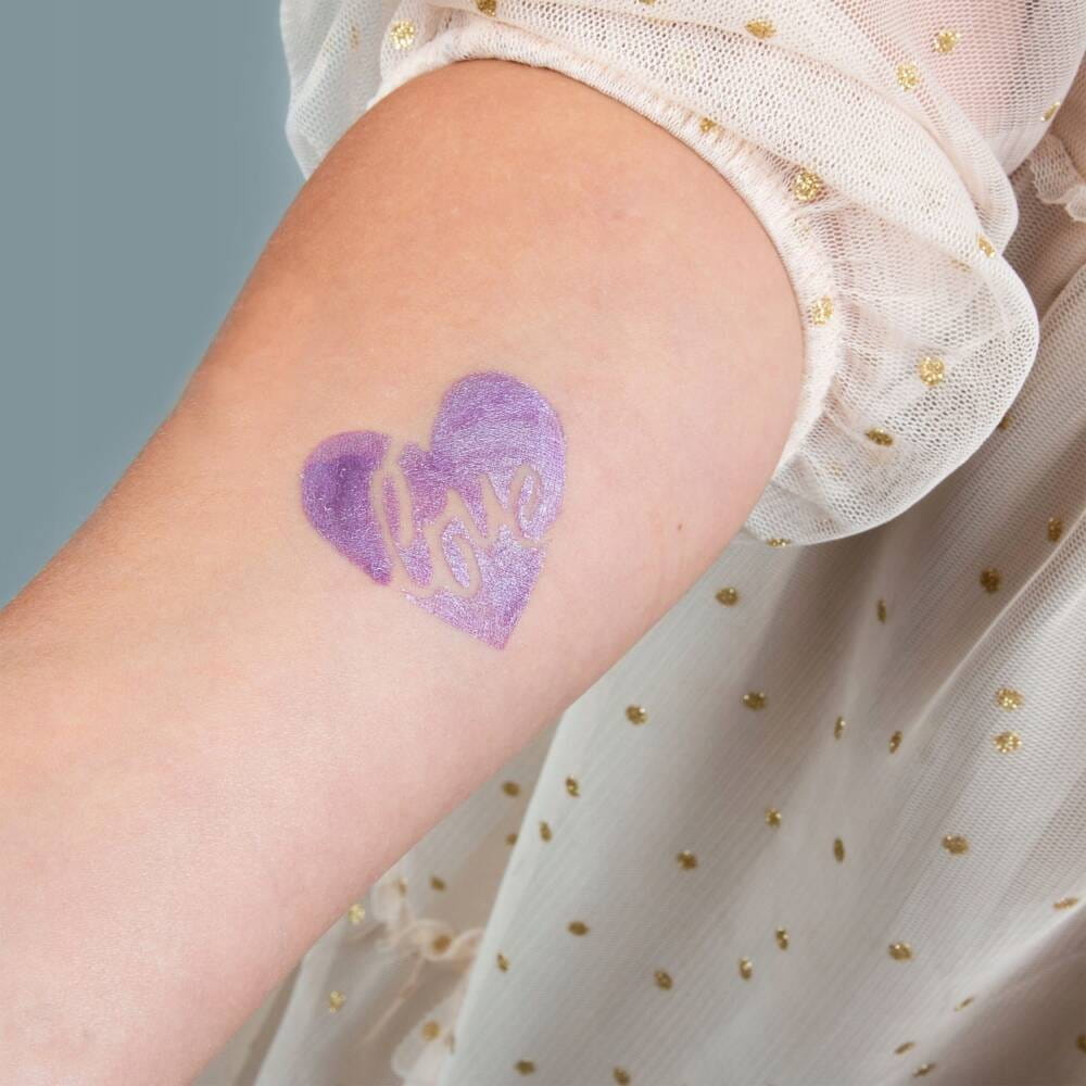 Brokatowe markery do robienia tatuaży wraz z szablonami do odrysowania. Błyszczące pisaki umożliwiają wykonanie personalizowanych obrazków na skórze lub odrysowanie ich z pośród 12 szablonów. Znajdziemy wśród nich ananasa, loda na patyku, babeczkę, czterolistną koniczynkę, konika morskiego, gekona, serce oraz motywy roślinne. Do całkowitego zmycia tatuażu wystarczy użyć płynu do demakijażu, czy micelarnego.