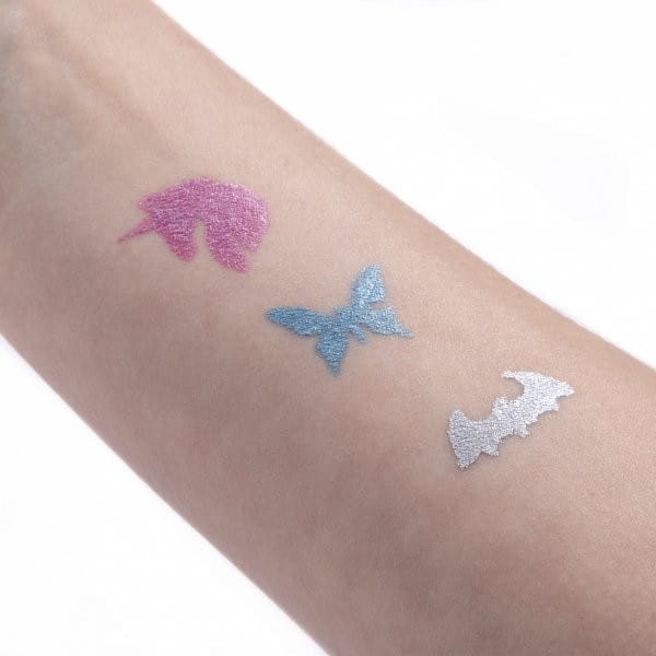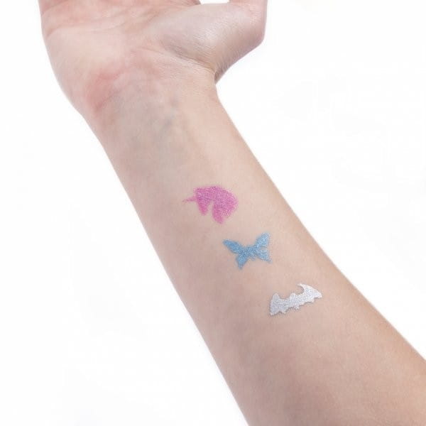 Brokatowe markery do robienia tatuaży wraz z szablonami do odrysowania. Błyszczące pisaki umożliwiają wykonanie personalizowanych obrazków na skórze lub odrysowanie ich z pośród 12 szablonów. Do całkowitego zmycia tatuażu wystarczy użyć płynu do demakijażu.