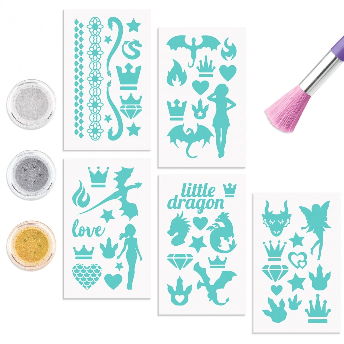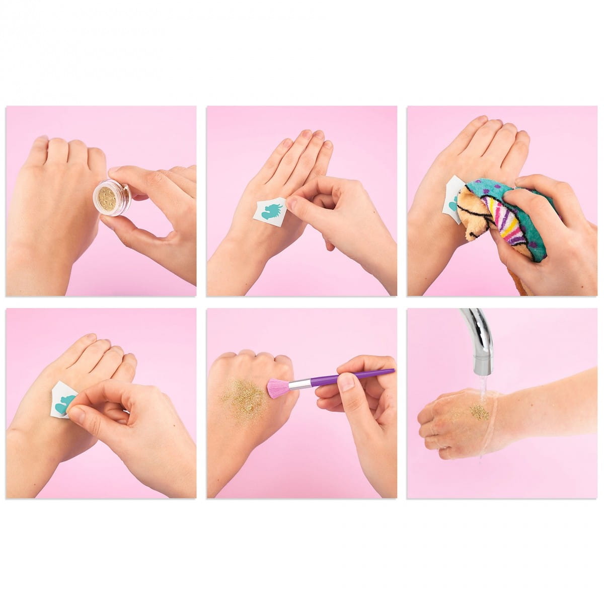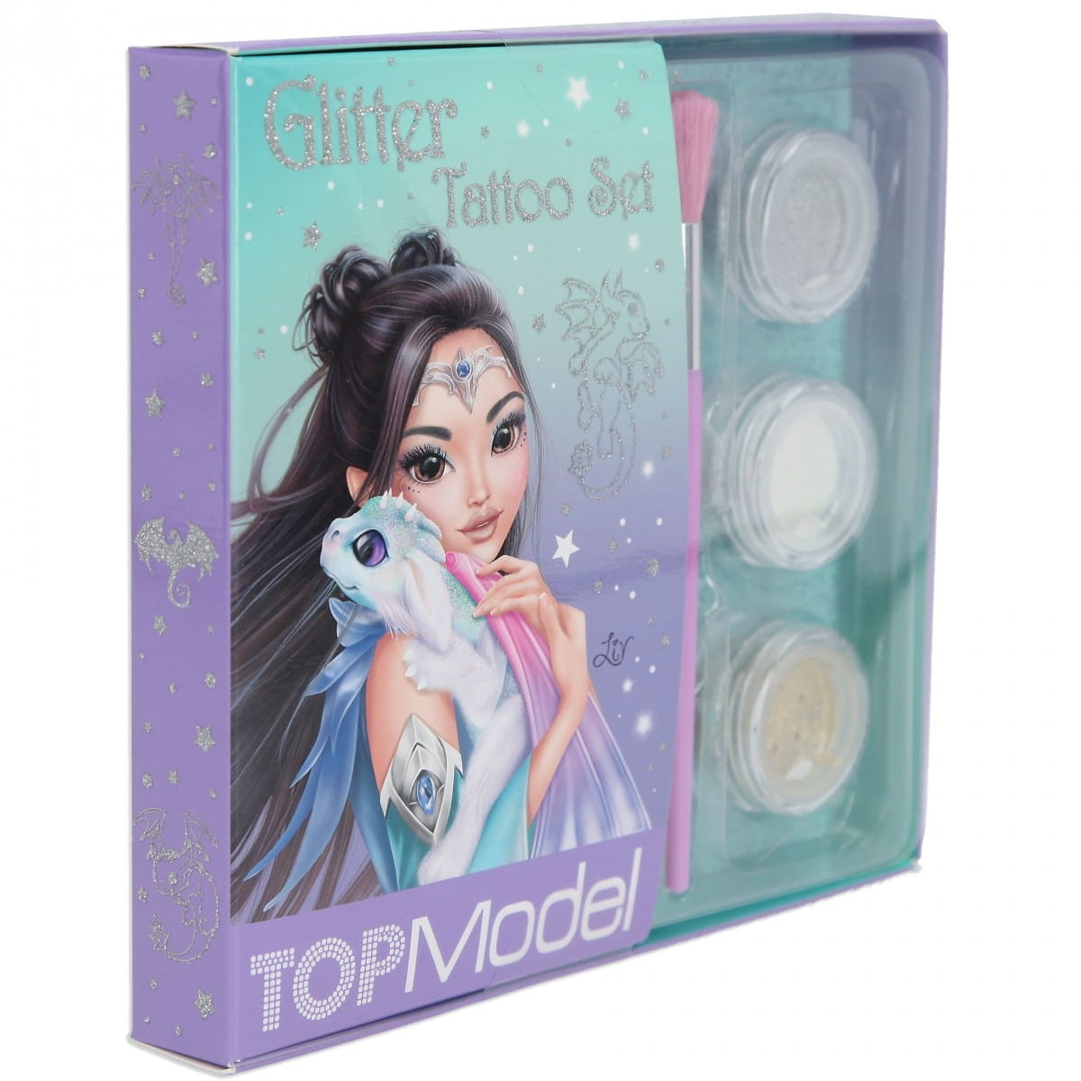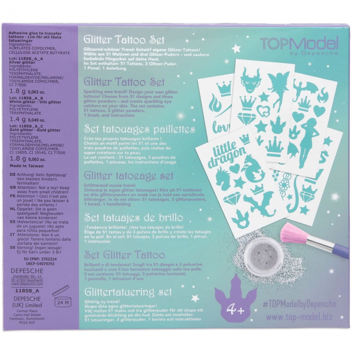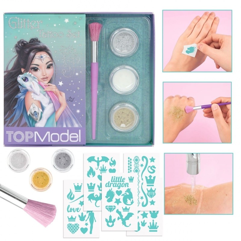Zestaw brokatowych Tatuaży TOPModel Glitter Tattoo Set do wykonania samodzielnie. Błyszczący komplet zawiera pędzelek, 3 słoiczki z brokatem oraz naklejki ze wzorami na skórę. Spośród 51 szablonów wybieramy ten, który się nam spodoba, należny go wyciąć i przykleić do skóry, namoczyć. Nastanie odkleić cienką folię z niego i posypać wybranym brokatem. Powstaną przepiękne dekoracje na ciele.