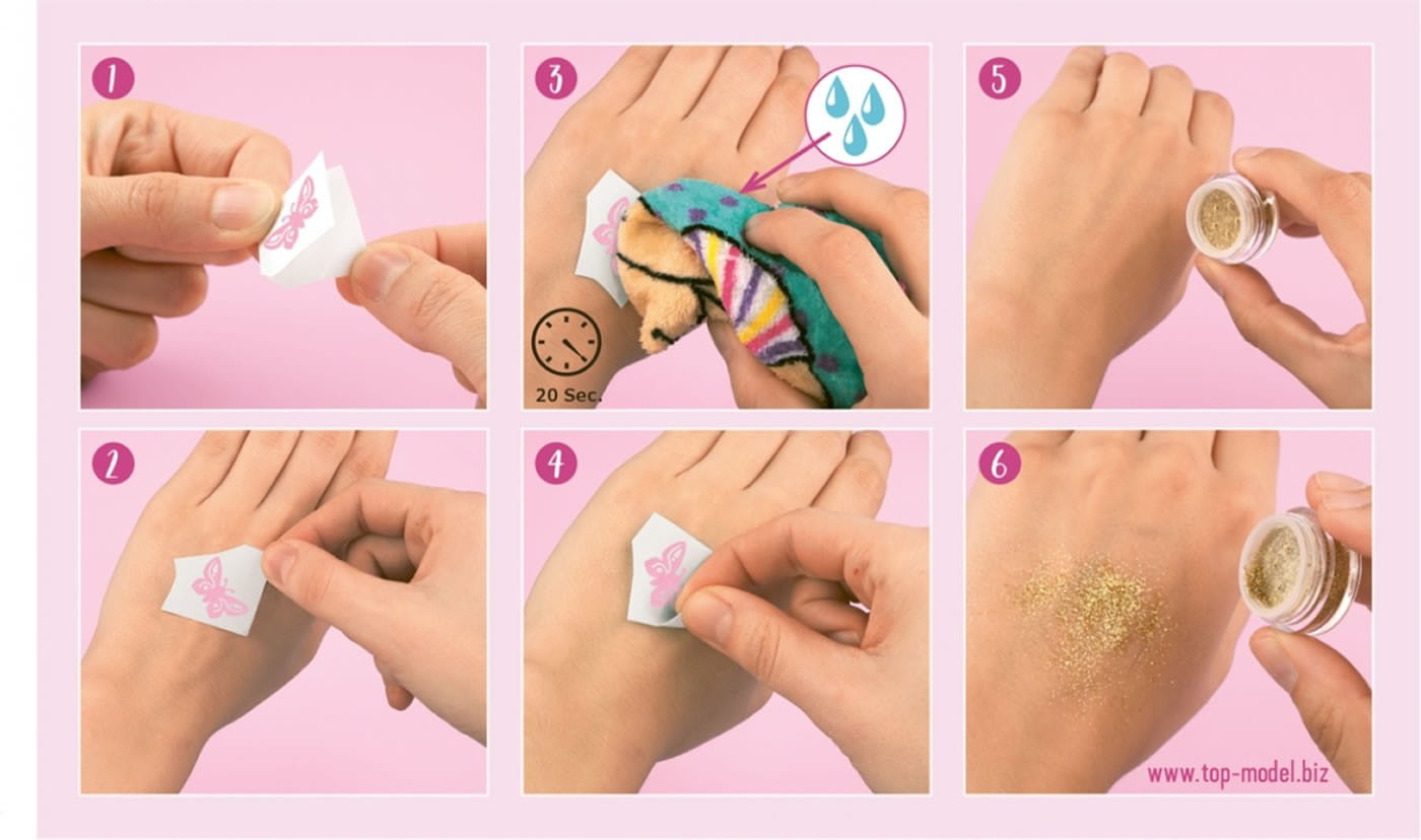 Zestaw brokatowych Tatuaży Top Model Glitter Tattoo do wykonania samodzielnie. Błyszczący komplet zawiera pędzelek, 3 słoiczki z brokatem oraz naklejki ze wzorami na skórę. Spośród 41 szablonów wybieramy ten, który się nam spodoba, należny go wyciąć i przykleić do skóry, namoczyć. Nastanie odkleić cienką folię z niego i posypać wybranym brokatem. Powstaną przepiękne dekoracje na ciele.