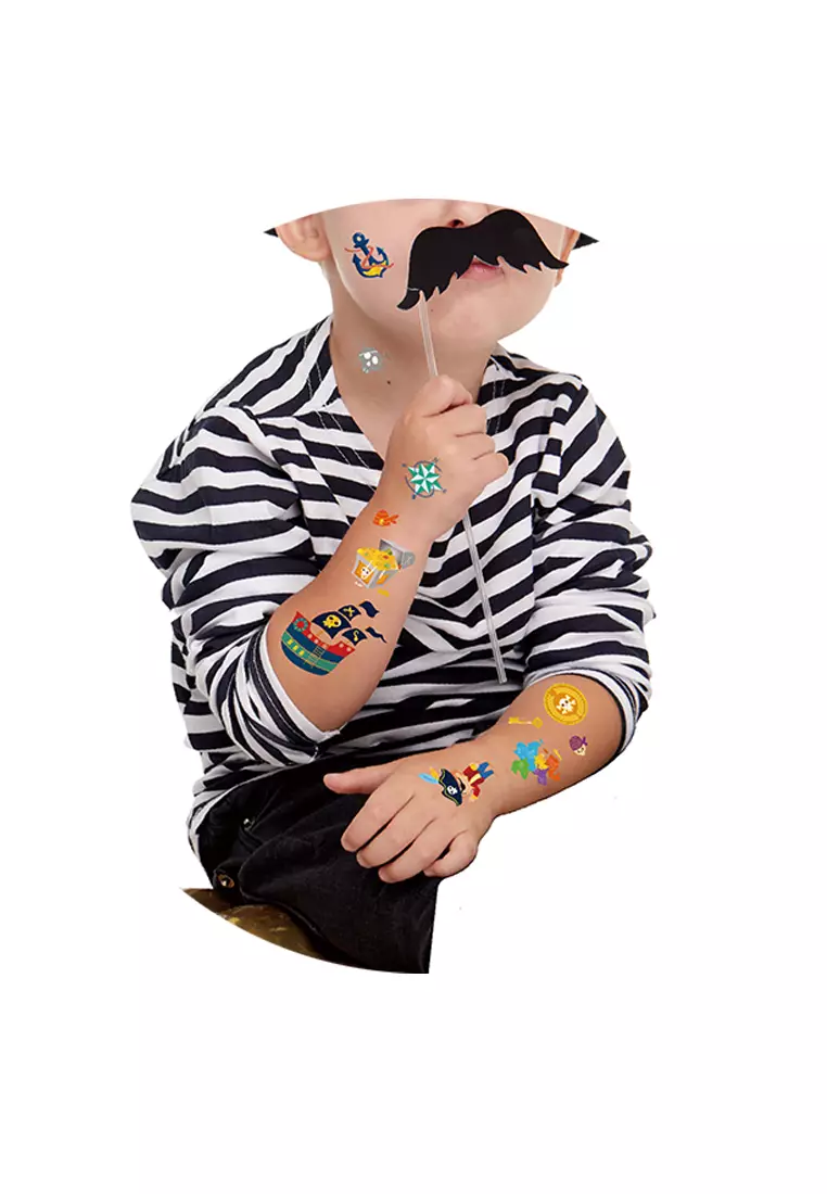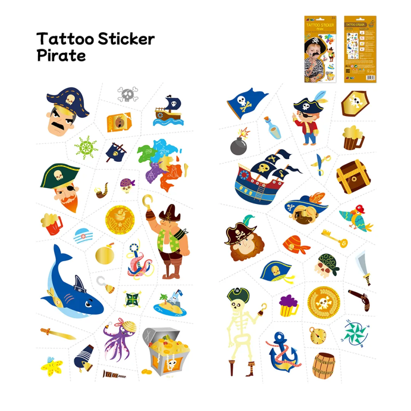 Tatuaże z piratami, skrzynią skarbów, bezludną wyspą i wieloma pirackimi motywami są bezpieczne dla skóry, mają kolorowe wzory ze złotym połyskiem, utrzymują się na skórze 3-5 dni.