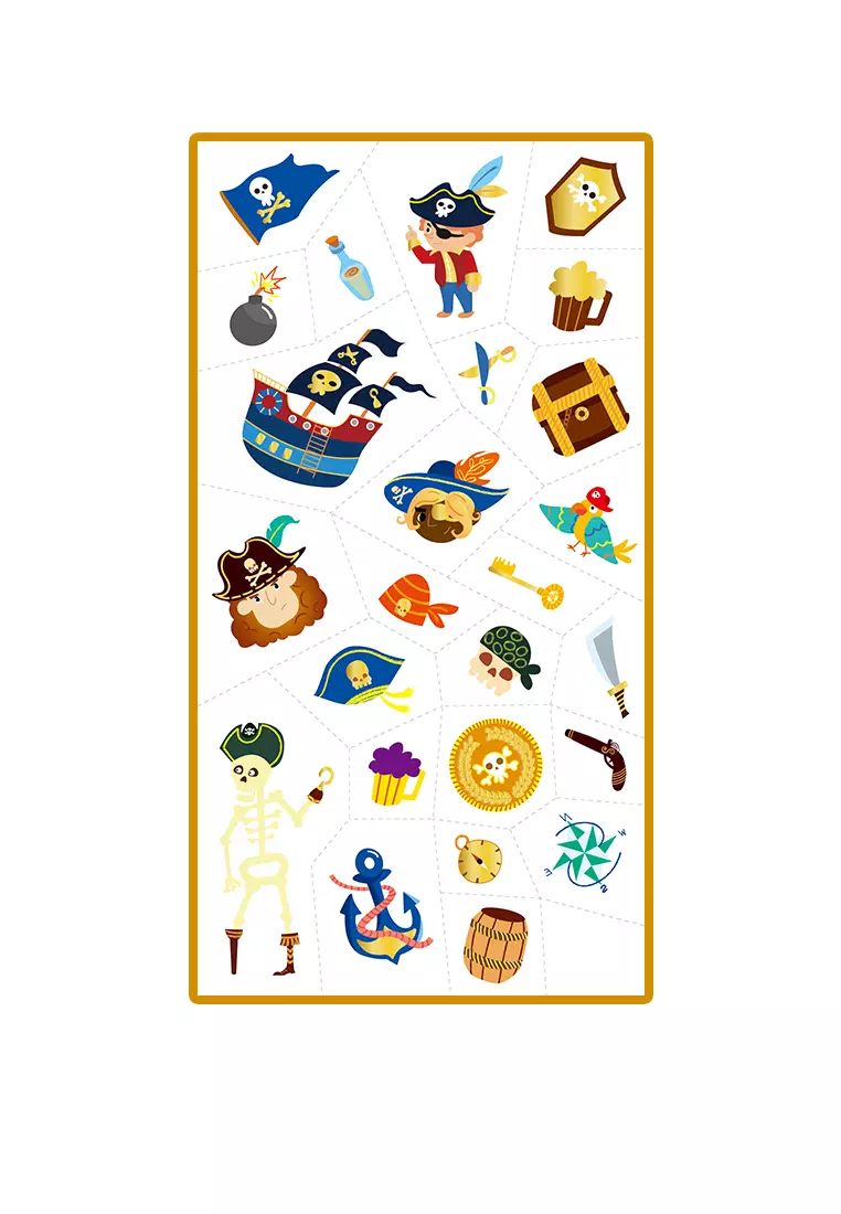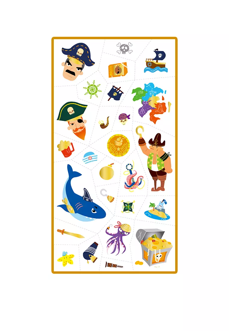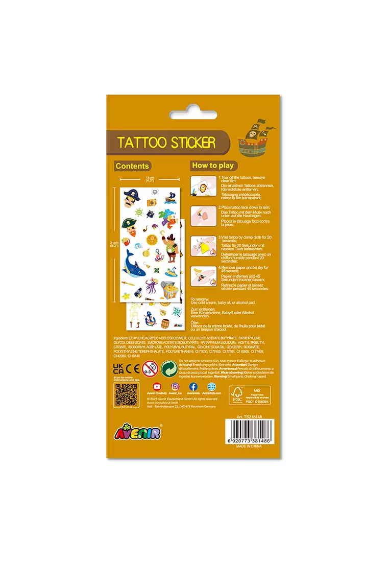 Wesołe naklejki udekorują dziecięce dłonie, raczki, czy nogi. Każdy tatuaż można niezależnie oderwać od arkusza i nanieść w dowolnym miejscu ciała, tworząc radosne dekoracje z motywem pirackim.