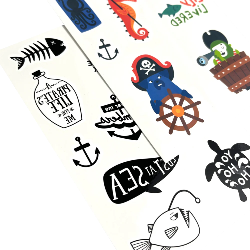 - Zestaw tatuaży zawiera 20 tymczasowych tatuaży dla dzieci, które uwielbiają przygody i historie z życia piratów. Te kolorowe tatuaże z pirackimi motywami są świetnym dodatkiem do dziecięcych zabaw w przebieranki, czy tematyczne imprezy.
