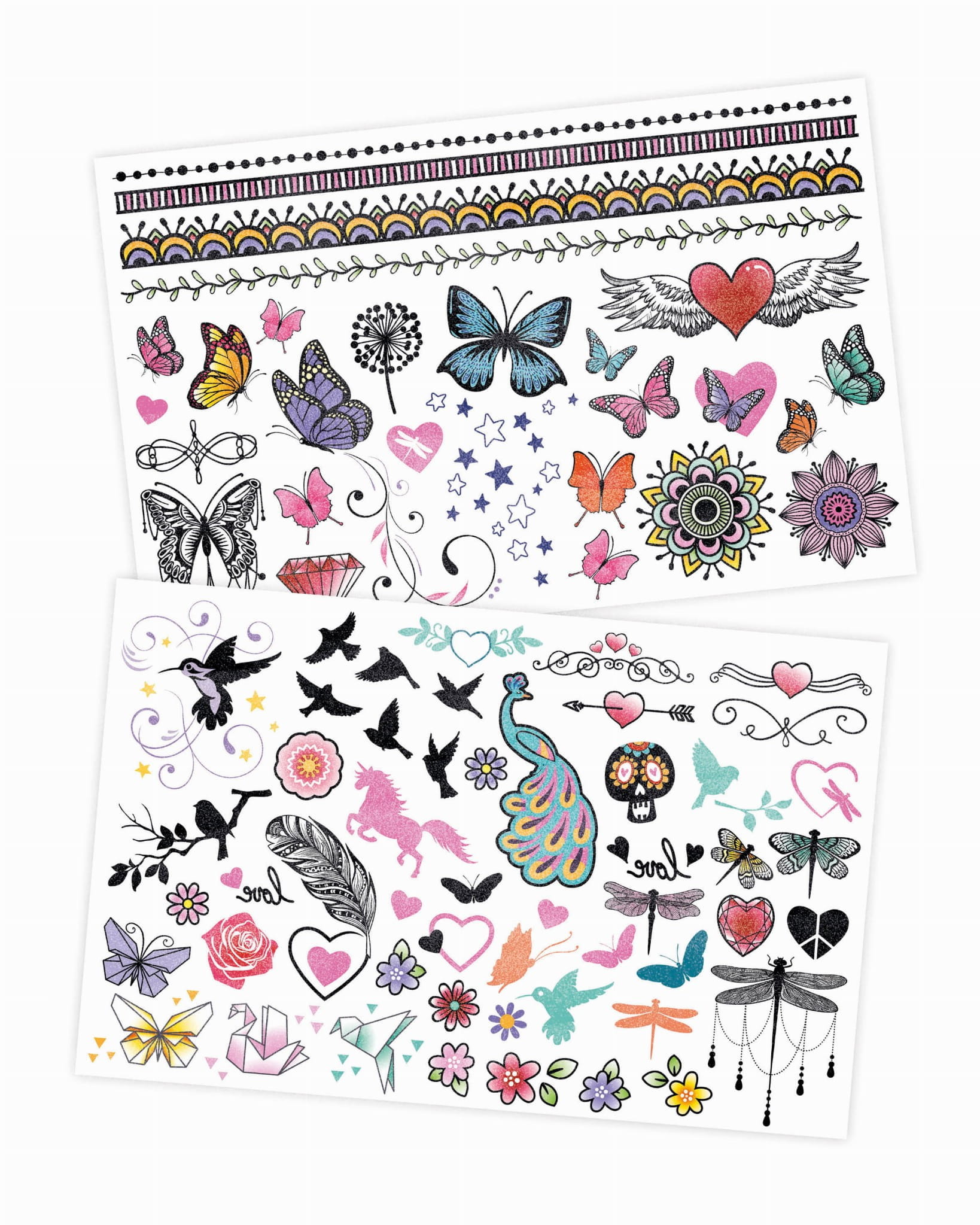 Dziecięce tatuaże Buki są bezpieczne dla skóry, mają połyskujące wzory w motyle, ważki, serca i wiele innych. Tymczasowe tatuaże udekorują dziecięce dłonie, czy nogi. Każdy tatuaż można niezależnie oderwać od arkusza i nanieść w dowolnym miejscu ciała, tworząc prześliczne dekoracje. Tatuaże są tymczasowe, całkowicie schodzą ze skóry, nie powodując podrażnień. Naklejki na skórę to 2 arkusze tatuaży.