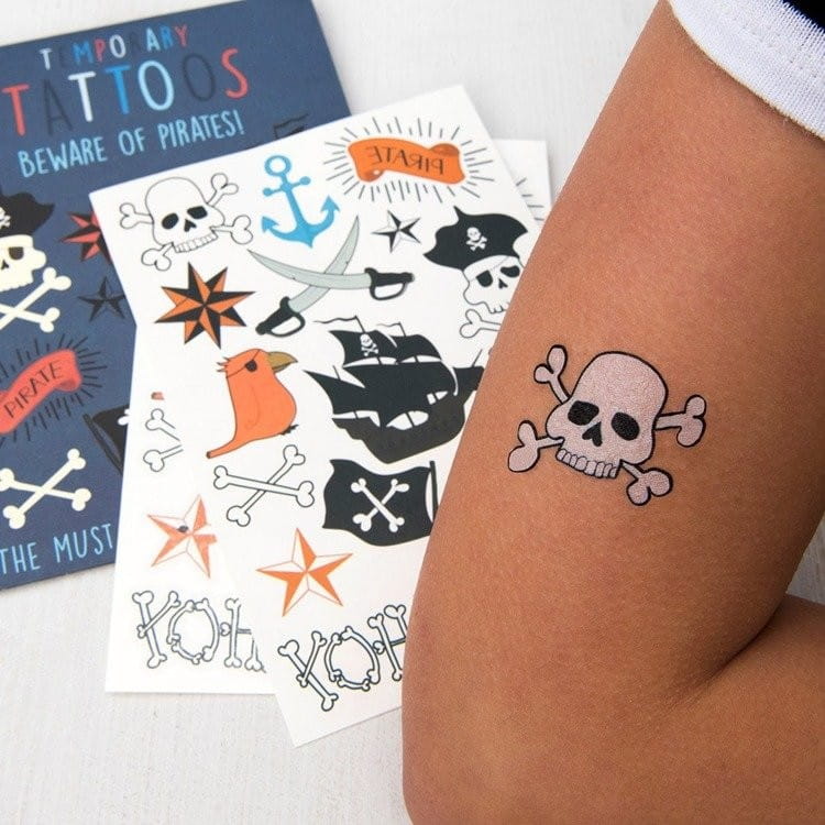 Tatuaże Rex London dla dzieci są bezpieczne dla skóry, mają lubiane przez dzieci wzory. Tatuaże są tymczasowe, całkowicie schodzą ze skóry, nie powodując podrażnień. Naklejki na skórę z pirackimi wzorami to 2 arkusze tatuaży.