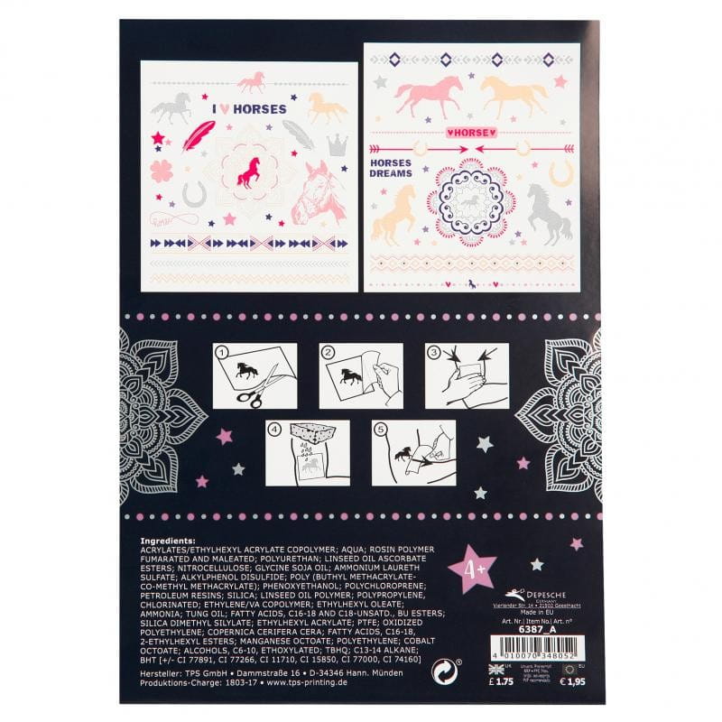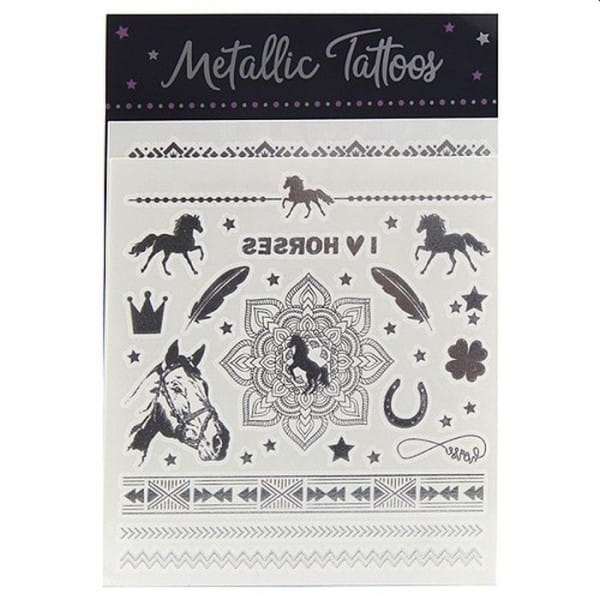 Dziecięce tatuaże z końmi są bezpieczne dla skóry, mają połyskujące wzory w kolorze srebrnym. Tymczasowe tatuaże udekorują dziecięce dłonie, czy nogi. Metaliczne Tatuaże w konie są tymczasowe, całkowicie schodzą ze skóry, nie powodując podrażnień. Naklejki na skórę to 2 arkusze tatuaży.
