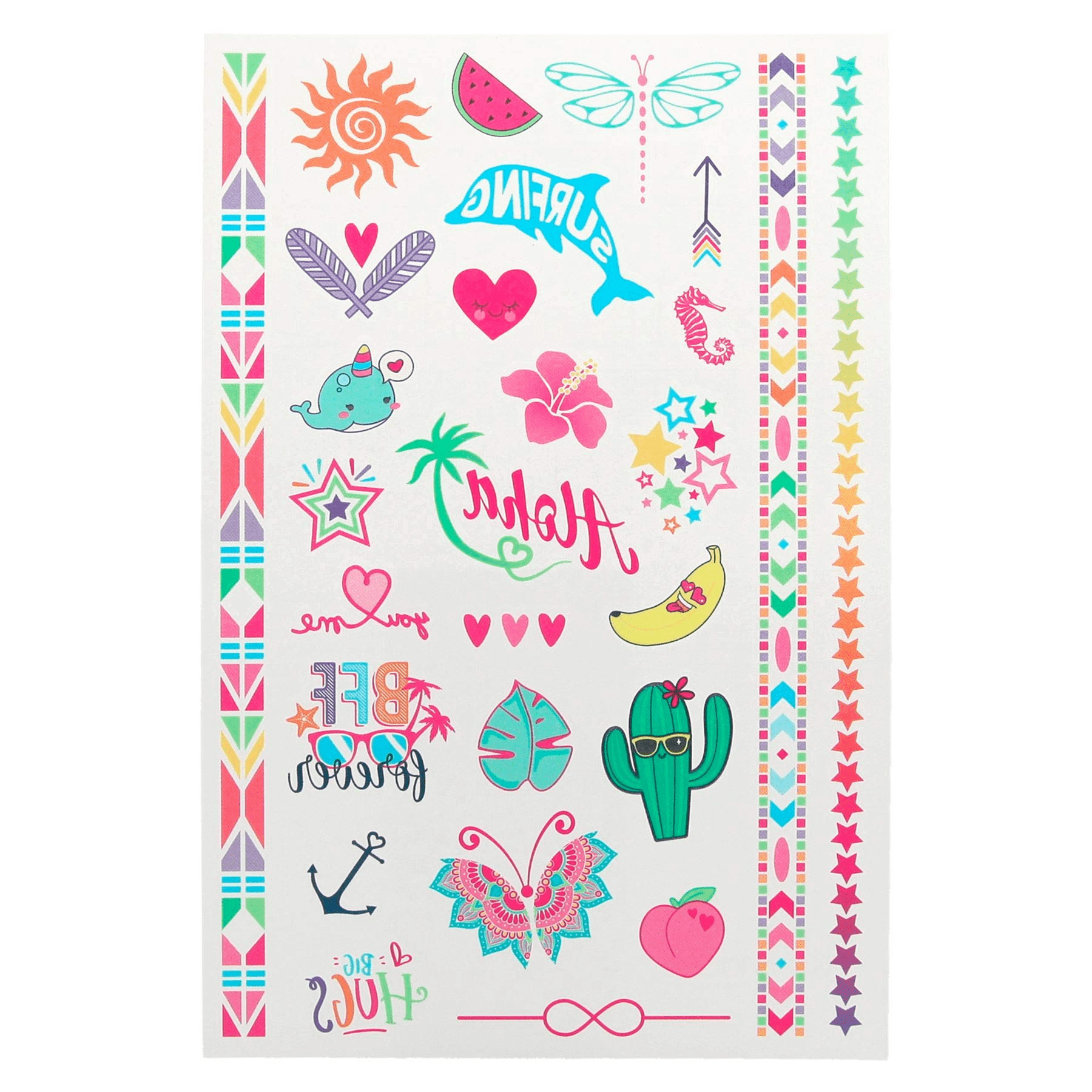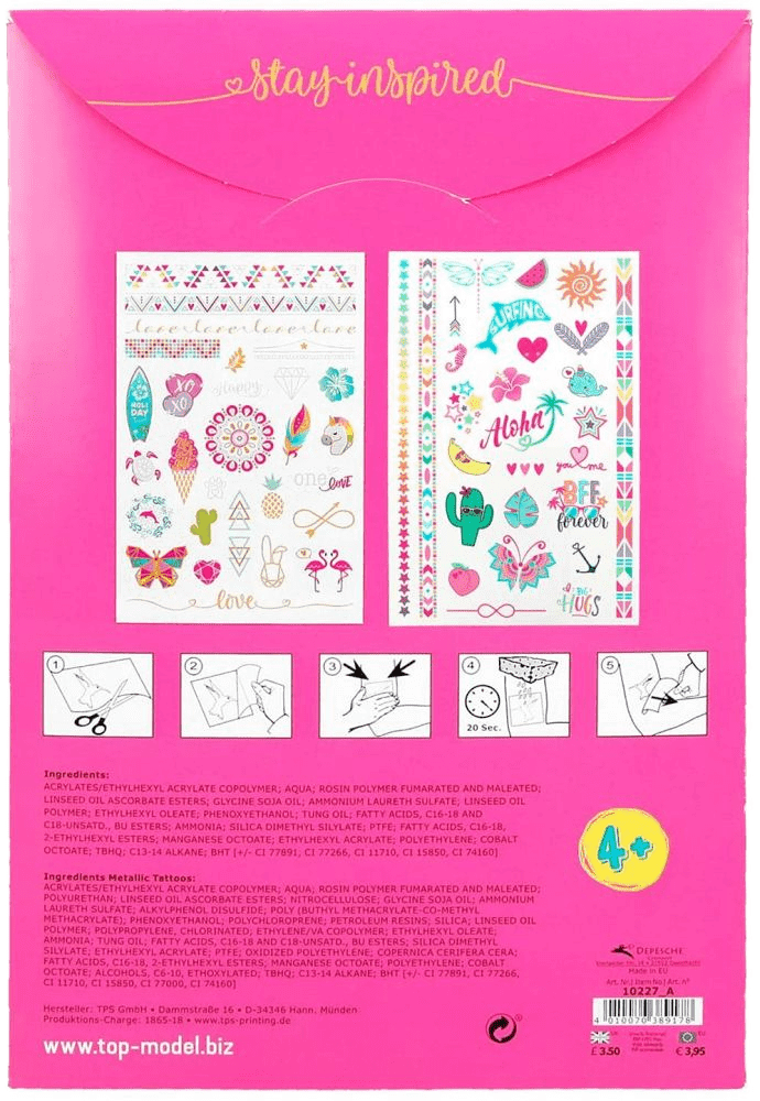 Kolorowe tatuaże TopModel są przeznaczone dla dzieci, bezpieczne dla skóry, zmywalne w wodzie, mają modne wzory i metaliczny połysk. Tatuaże są tymczasowe, całkowicie schodzą ze skóry, nie powodując podrażnień.