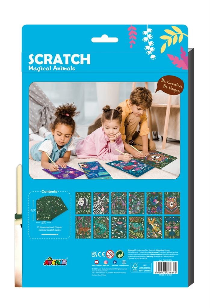 Zdrapywanki ze zwierzęcymi motywami od AvenirKids to arkusze pokryte specjalną warstwą do zadrapywania patyczkiem, pod którą umieszczone są kolorowe wzory. Zadanie polega na zdrapaniu załączonym rysikiem zaznaczonych miejsc na kartach. Patyczek o dwóch końcówkach umożliwia kreatywne drapanie różnych wzorów. Jest to rodzaj kolorowania przez zdrapywane. Pod spodem umieszczone jest tęczowe tło. W zestawie 13 kartek z delikatnienie zaznaczonym miejscem do zdrapywania oraz 2 tęczowe czyste zdrapek. Wciągająca kreatywna zabawa.