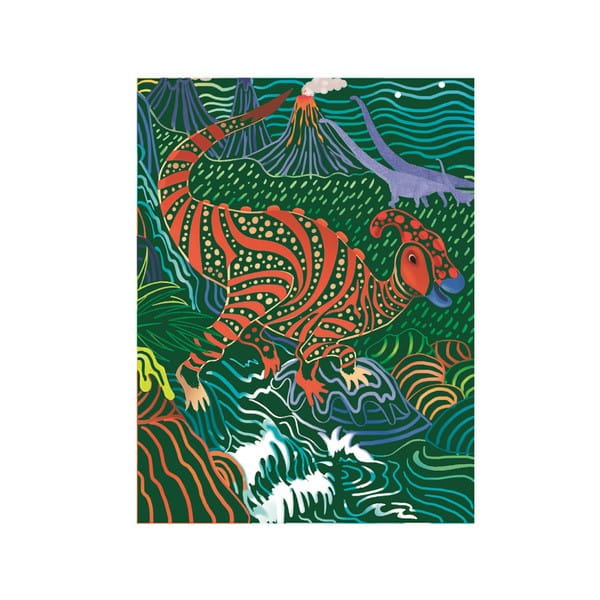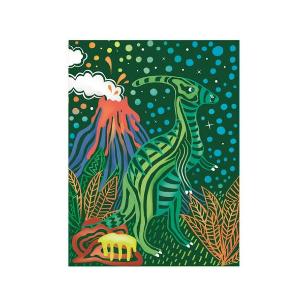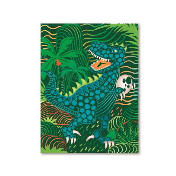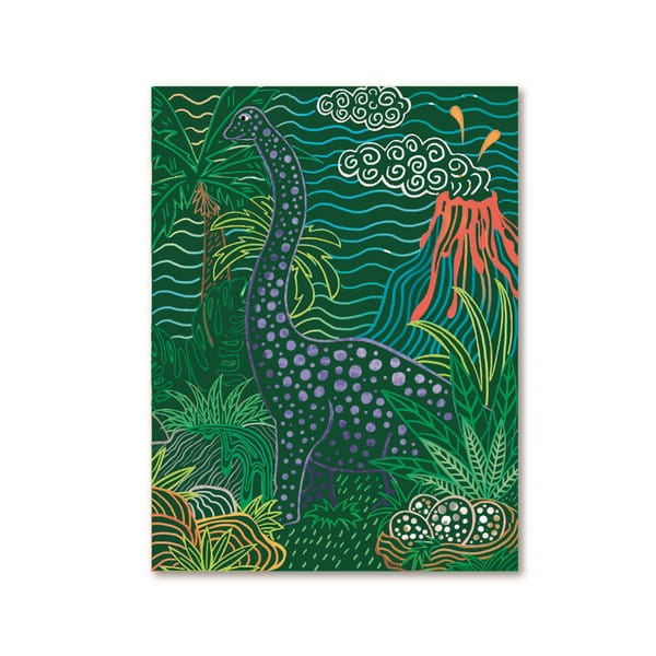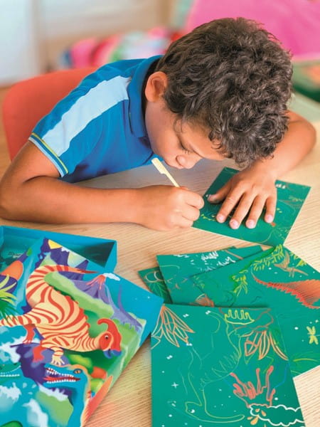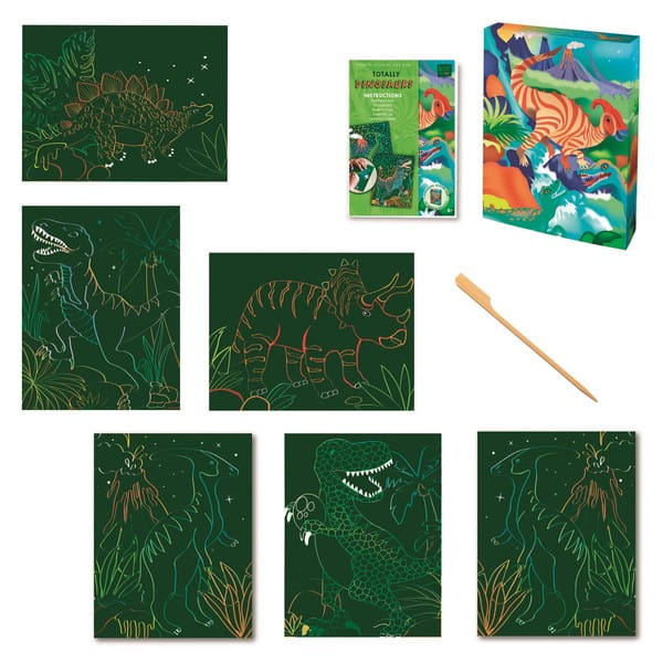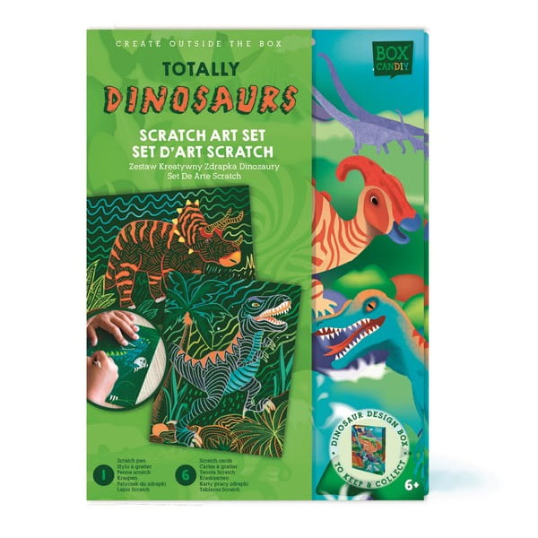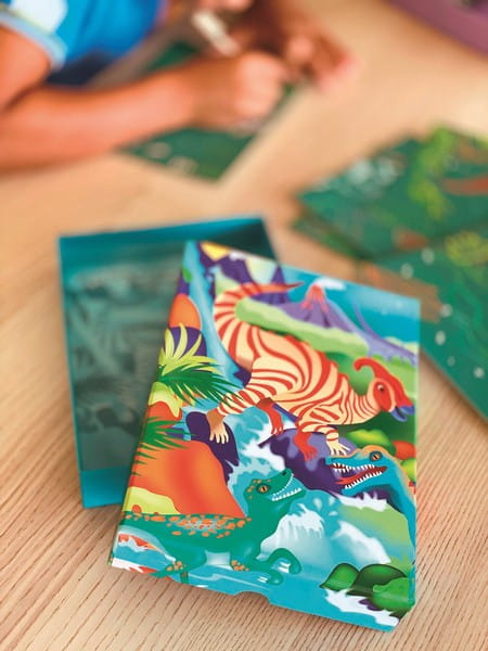 Zestaw wydrapywanek dla dzieci z motywem dinozaurów. Czarne karty kryją pod spodem świat zwierząt pełen roślinności i kolorów. Zadanie polega na zdrapaniu wosku załączonym drewnianym z zaznaczonych miejsc na kartach. Stopniowo odsłoni się niezwykły rysunek. Zdrapywanki są kolorowe, bogate w szczegóły, wymagają większej precyzji i stanowią piękną ozdobę.
