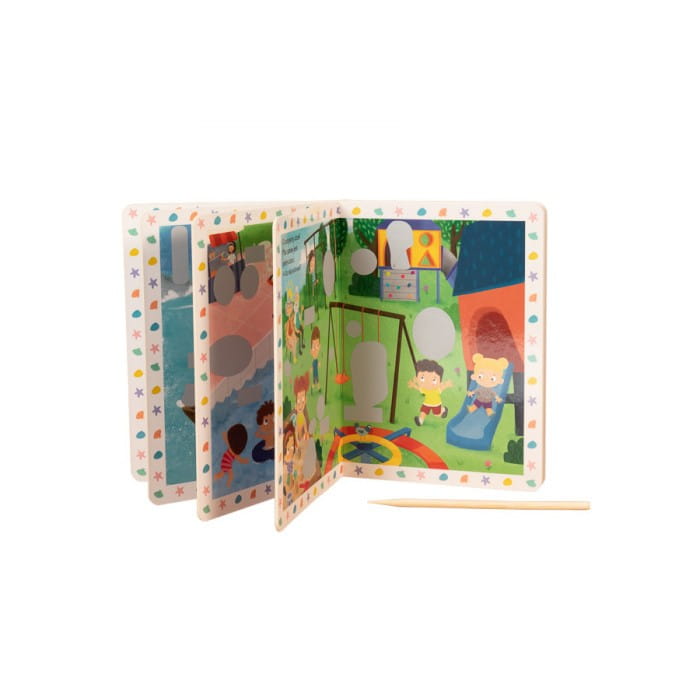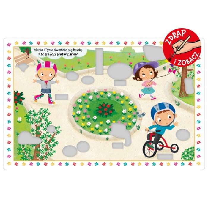 Zdrapywanka z Manią i Tyniem. Wiosna poprzez zabawę wspiera rozwój manualny najmłodszych. Używając patyczka, dzieci zdrapują srebrną warstwę i odkrywają całą ilustrację. To doskonały trening koncentracji. Zdrapywanki to komplet: książeczka i patyczek.