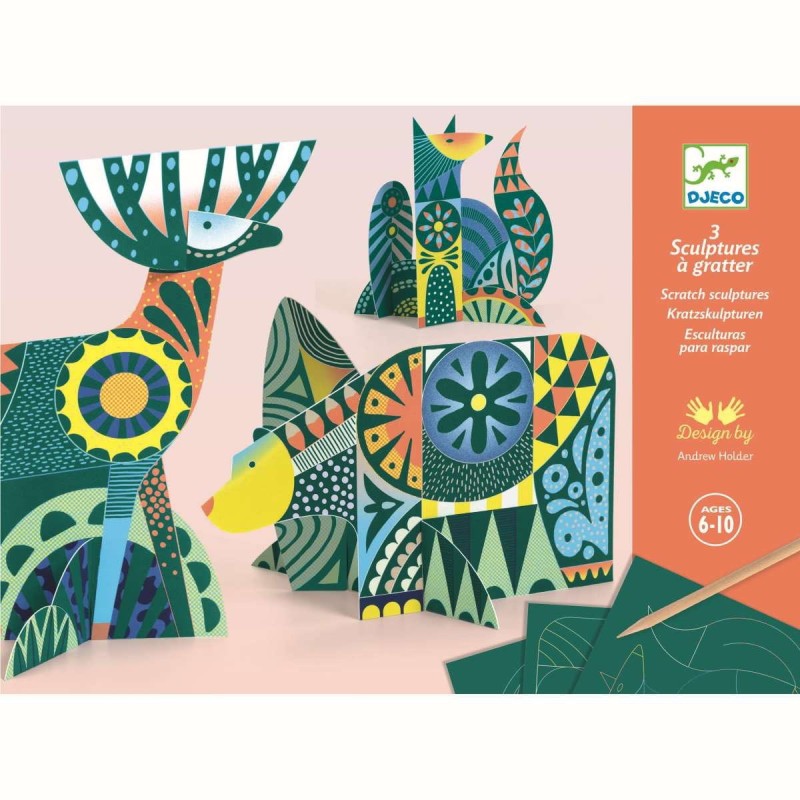 Zdrapywanki 3D Djeco mają bogate w szczegóły wzory do wydrapywania z motywami zwierząt ludowych. Zadanie polega na zdrapaniu wosku załączonym rysikiem z zaznaczonych miejsc na kartach. Stopniowo odsłoni się niezwykły rysunek. Następnie montuje się podstawy i otrzymujemy stojące figurki.