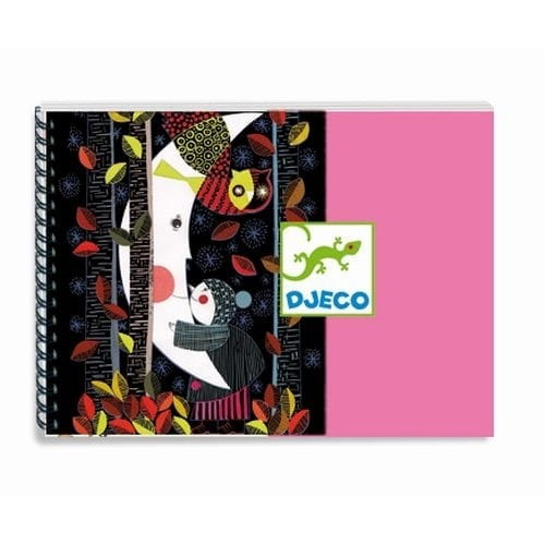 W kartonowej teczce znajdują się 4 arkusze wydrapywanek Djeco Incredible Night przedstawiające las nocą Zadanie polega na zdrapaniu wosku załączonym rysikiem z zaznaczonych miejsc na kartach. Stopniowo odsłoni się niezwykły rysunek. Zdrapywanki są kolorowe i stanowią piękną ozdobę.
