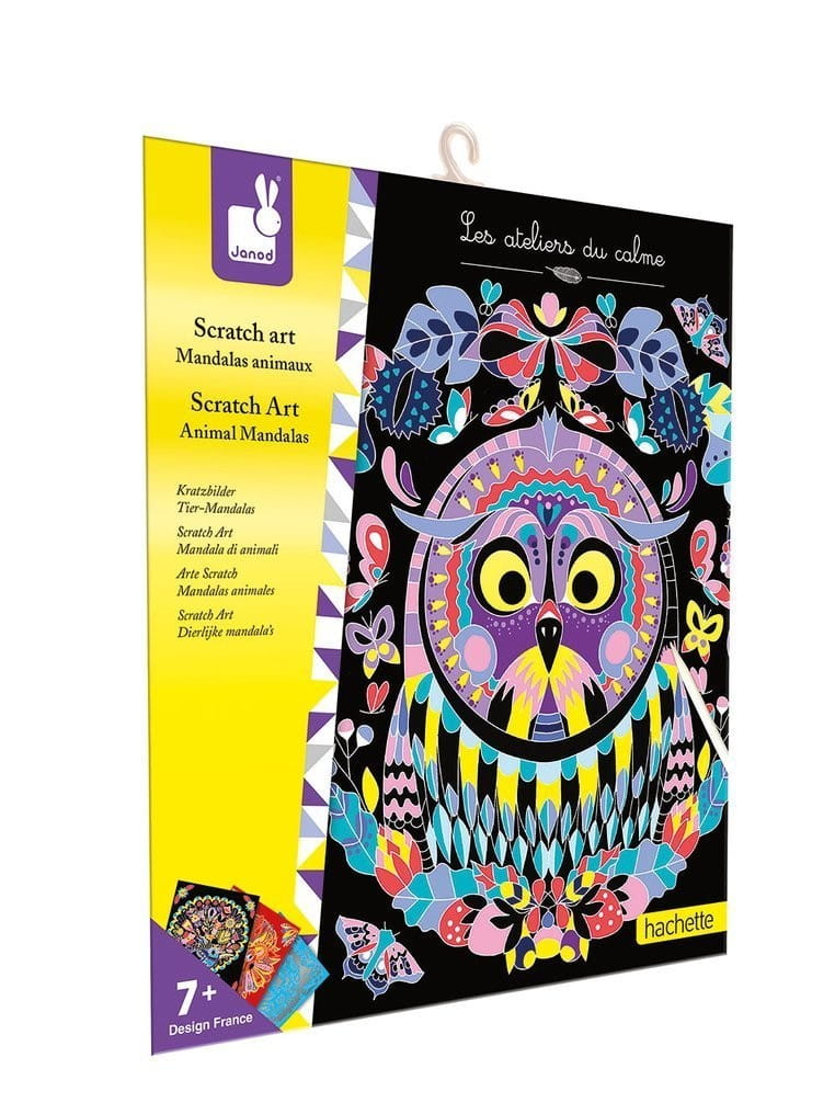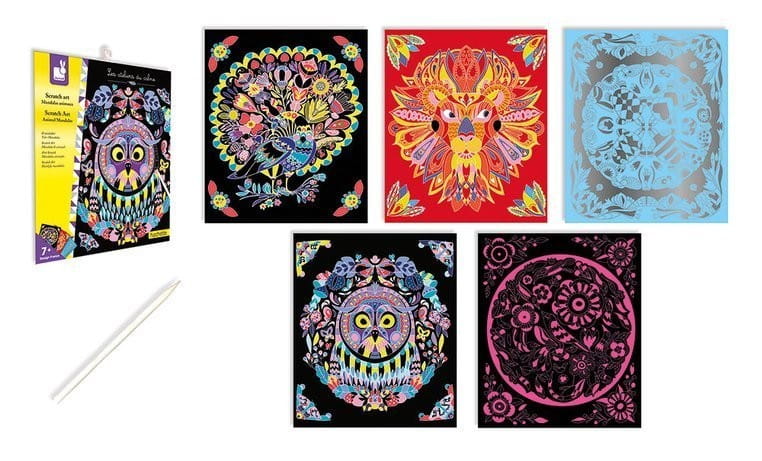 Zdrapywanki Janod z pięknymi zwierzęcymi wzorami. W teczce znajduje się 5 arkuszy do wydrapywania oraz specjalny rysik. Zadanie polega na zdrapaniu załączonym rysikiem zaznaczonych miejsc na planszach. Obrazki ze zwierzętami nabierają kolorów. Zdrapywanie to dla dziecka długi czas angażującej i uspokajającej, wyciszającej zabawy, a gotowe obrazki staną się wspaniałą dekoracją dziecięcego pokoju.