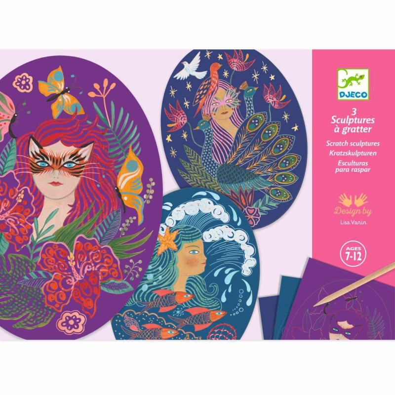 Artystyczne zdrapywanki Djeco zaprojektowane przez Lisa Vanin. Duże arkusze wydrapywanek Djeco z nimfami mają bogate w szczegóły wzory do wydrapywania. Zadanie polega na zdrapaniu wosku załączonym rysikiem z zaznaczonych miejsc na kartach. Stopniowo odsłoni się niezwykły rysunek. Zdrapywanki są kolorowe, bogate w szczegóły, wymagają większej precyzji i stanowią piękną ozdobę.