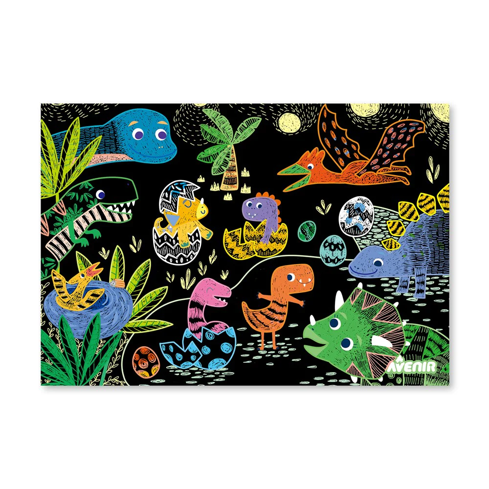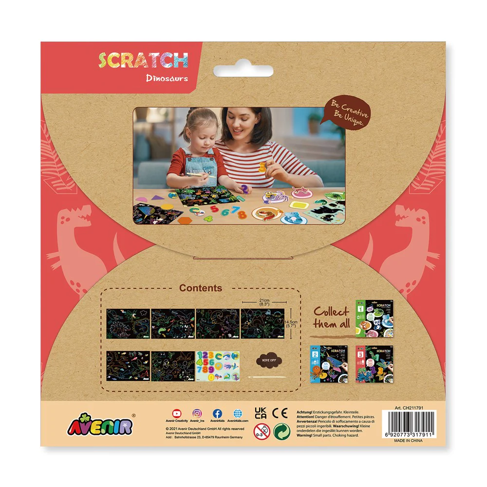 W kolorowej teczce znajdują się arkusze czarnych wydrapywanek AvenirKids z dinozaurami dodatkowe elementy do liczenia i rozpoznawania kolorów. Zadanie polega na zdrapaniu załączonym rysikiem zaznaczonych miejsc na kartach. Jest to rodzaj kolorowania przez zdrapywane. Pod spodem umieszczone jest tęczowe tło, powstałe dinozaury są całkiem przyjacielskie. Następnie dzieci mogą odnajdywać różne gatunki dinozaurów i przypisywać do nich cyfry.