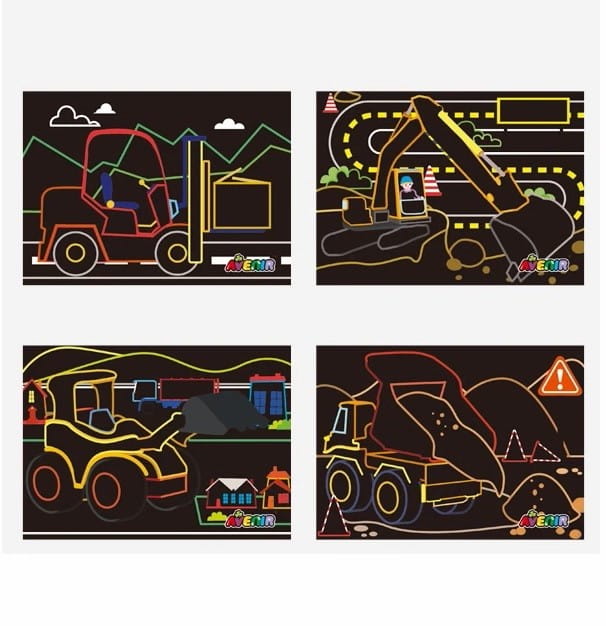 W kolorowej teczce znajdują się 8 arkuszy czarnych wydrapywanek AvenirKids z maszynami na placu budowy. Zadanie polega na zdrapaniu załączonym rysikiem zaznaczonych miejsc na kartach. Jest to rodzaj kolorowania przez zdrapywane. Pod spodem umieszczone jest tęczowe tło, powstałe obrazki są kolorowe. Wciągająca kreatywna zabawa.