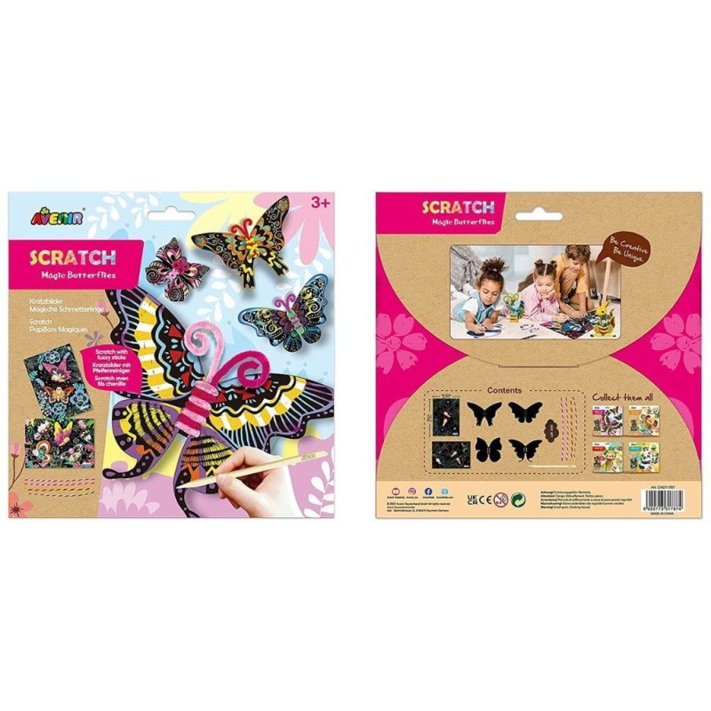 Zdrapywanki Magic Butterflies AvenirKids to kreatywny zestawem do wydrapywania oraz dekorowania obrazków. Zadanie polega na zdrapaniu załączonym rysikiem zaznaczonych miejsc na kartach. Jest to rodzaj kolorowania przez zdrapywane. Pod spodem umieszczone jest tęczowe tło, powstałe obrazki są kolorowe. Można je potem udekorować załączonymi elementami. Wciągająca kreatywna zabawa.