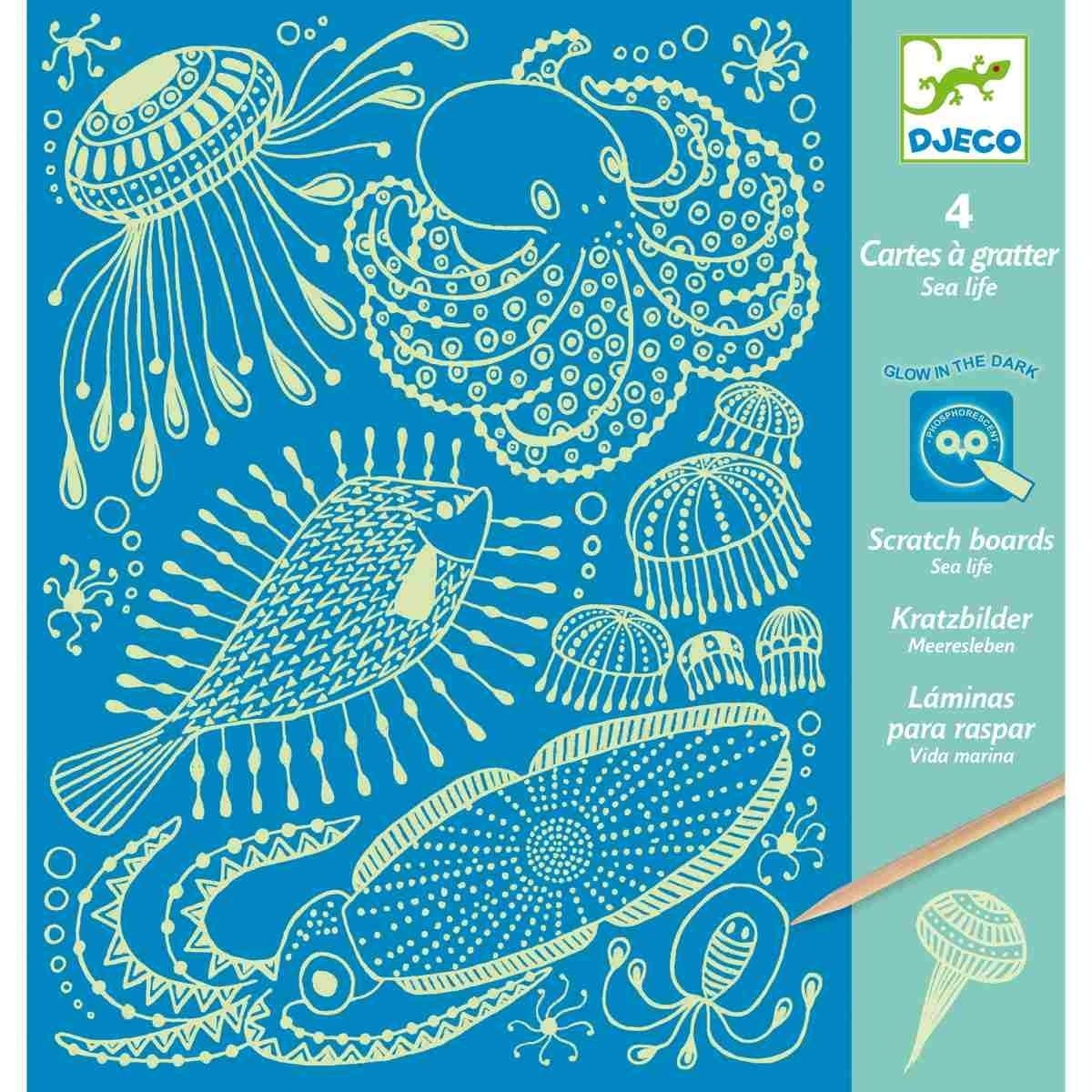 Fosforyzujące wydrapywani Djeco świecą w ciemności. W kartonowej teczce znajdują się 4 arkusze ciekawych ilustracji do wydrapywania marki Djeco. Zadanie polega na zdrapaniu wosku załączonym rysikiem z zaznaczonych miejsc na kartach. Stopniowo odsłoni się niezwykły obraz z morskich głębin. Zdrapywanki są bogate w szczegóły, wymagają większej precyzji i stanowią piękną ozdobę.