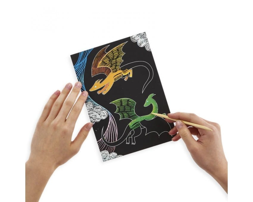 Uwielbiona przez dzieci zdrapywanka Ooly z obrazami przedstawiającymi smoki. Kreatywny zestaw zawiera czarne kartki pokryte specjalną warstwą z narysowanymi konturami lub gładkie oraz rysik do drapania. Zdrapki kryją pod spodem różne tła. Wystarczyć zdrapać wierzchnią warstwę drewnianym patyczkiem i stworzyć ciekawe ilustracje.