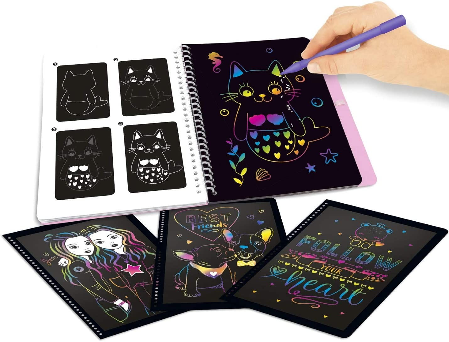 Uwielbiona przez dzieci zdrapywanka pełna modnych wzorów do odkrycia. Kreatywny zestaw zawiera czarne kartki pokryte specjalną warstwą wosku z narysowanymi konturami oraz rysik do drapania.