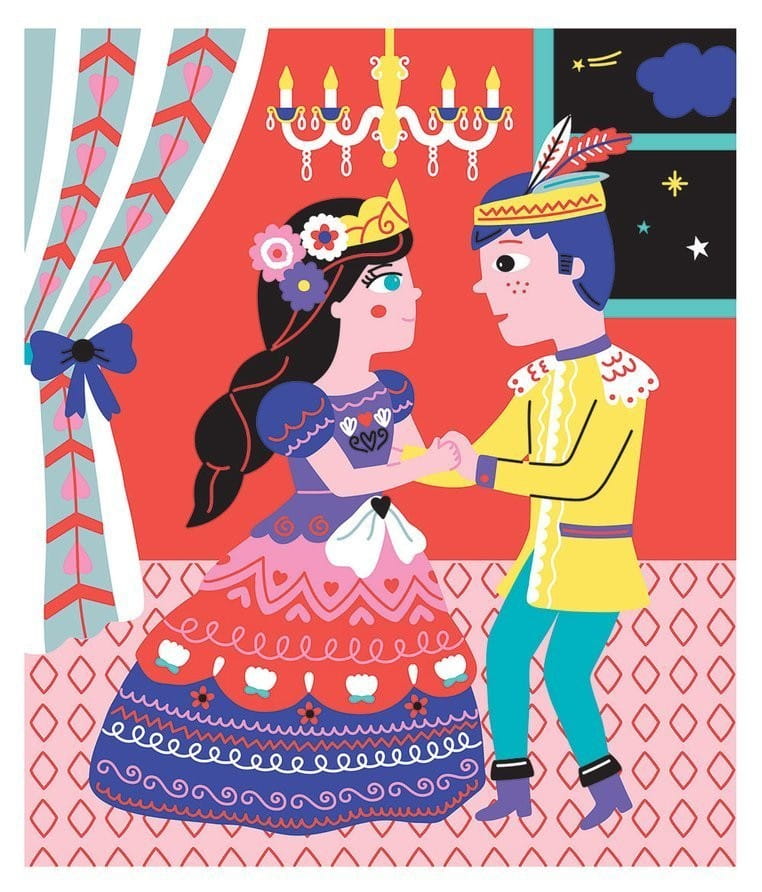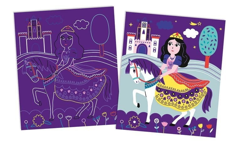 W teczce znajduje się 8 arkuszy do wydrapywania. Zadanie polega na zdrapaniu specjalnego, czarnego wosku załączonym rysikiem w zaznaczonych miejscach na planszach. Obrazki z księżniczkami na balu, podczas jazdy konnej, czy na pałacowych schodach nabiorą żywych kolorów. Zdrapywanie to dla dziecka długi czas angażującej i uspokajającej, wyciszającej zabawy, a gotowe obrazki staną się wspaniałą dekoracją dziecięcego pokoju.