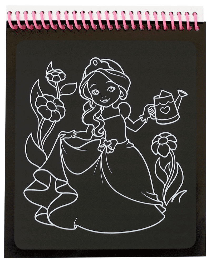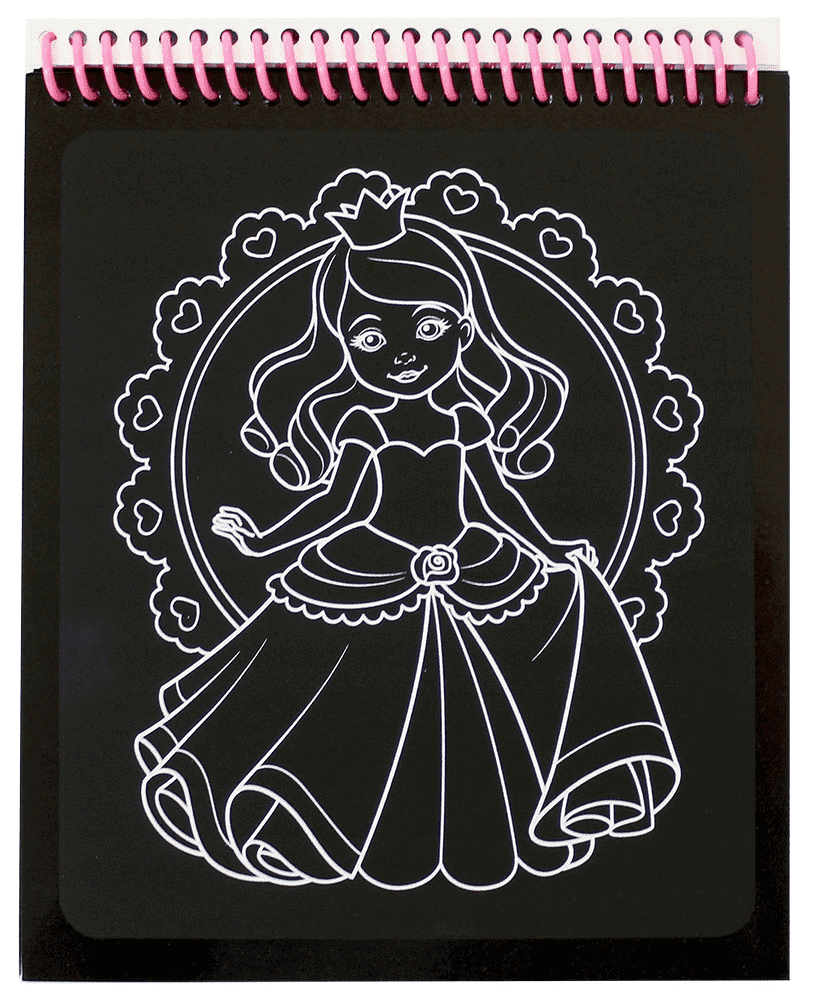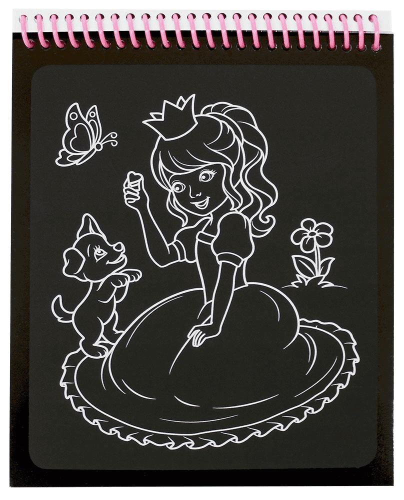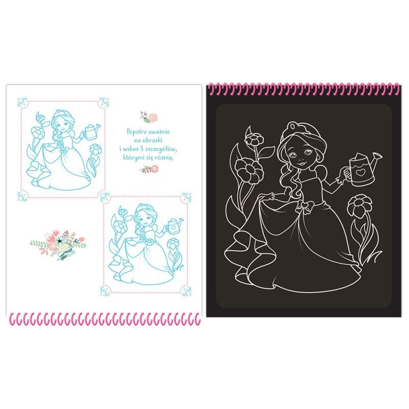 Notes na kołowrotku pełen arkuszy wydrapywanek z księżniczkami i nie tylko. Czarne karty zdrapki kryją pod spodem kreatywne obrazy do zdrapania. Zadanie polega na zdrapaniu wosku załączonym różowym rysikiem z zaznaczonych miejsc na kartach. Stopniowo odsłoni się kolorowe tło. Zdrapywanki są kolorowe, błyszczące i stanowią piękną ozdobę. Zdrapywani mają też zadania do wykonania.