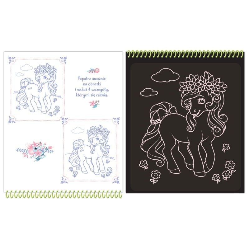Notes na kołowrotku pełen arkuszy wydrapywanek z konikami i nie tylko. Czarne karty zdrapki kryją pod spodem kreatywne obrazy do zdrapania. Zadanie polega na zdrapaniu wosku załączonym różowym rysikiem z zaznaczonych miejsc na kartach. Stopniowo odsłoni się kolorowe tło. Zdrapywanki są kolorowe, błyszczące i stanowią piękną ozdobę. Zdrapywani mają też zadania do wykonania.