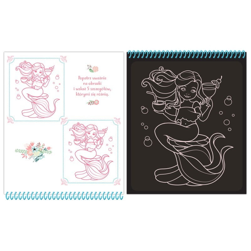 Notes na kołowrotku pełen arkuszy wydrapywanek z syrenkami i nie tylko. Czarne karty zdrapki kryją pod spodem kreatywne obrazy do zdrapania. Zadanie polega na zdrapaniu wosku załączonym różowym rysikiem z zaznaczonych miejsc na kartach. Stopniowo odsłoni się kolorowe tło. Zdrapywanki są kolorowe, błyszczące i stanowią piękną ozdobę. Zdrapywani mają też zadania do wykonania.