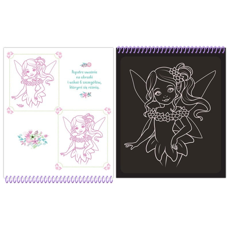 Notes na kołowrotku pełen arkuszy wydrapywanek z wróżkami i nie tylko. Czarne karty zdrapki kryją pod spodem kreatywne obrazy do zdrapania. Zadanie polega na zdrapaniu wosku załączonym różowym rysikiem z zaznaczonych miejsc na kartach. Stopniowo odsłoni się kolorowe tło. Zdrapywanki są kolorowe, błyszczące i stanowią piękną ozdobę. Zdrapywani mają też zadania do wykonania.