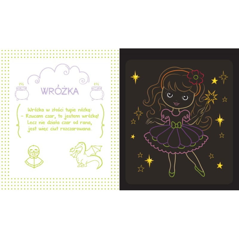Notes na kołowrotku pełen arkuszy wydrapywanek z bajkowymi obrazkami oraz krótkimi wierszykami. Czarne karty zdrapki kryją pod spodem kreatywne obrazy do zdrapania. Zadanie polega na zdrapaniu wosku załączonym rysikiem z zaznaczonych miejsc na kartach. Stopniowo odsłoni się kolorowe tło. Zdrapywanki są kolorowe, błyszczące i stanowią piękną ozdobę.