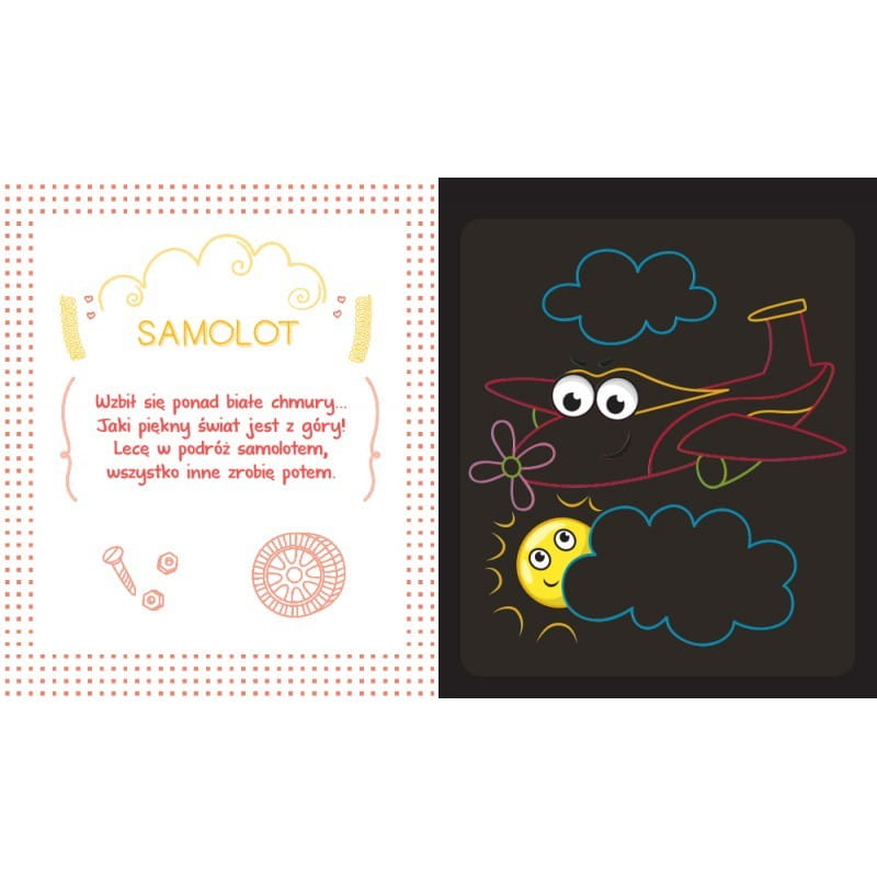 Notes na kołowrotku pełen arkuszy wydrapywanek z pojazdami oraz krótkimi wierszykami o pojazdach. Czarne karty zdrapki kryją pod spodem kreatywne obrazy do zdrapania. Zadanie polega na zdrapaniu wosku załączonym rysikiem z zaznaczonych miejsc na kartach. Stopniowo odsłoni się kolorowe tło. Zdrapywanki są kolorowe, błyszczące i stanowią piękną ozdobę.
