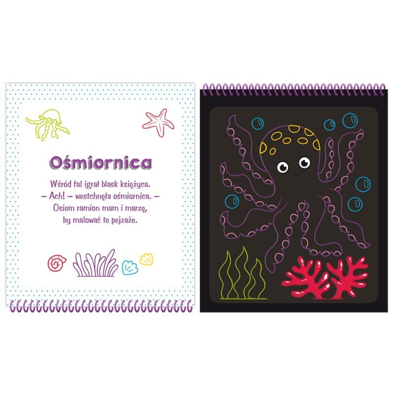 Notes na kołowrotku pełen arkuszy wydrapywanek ze stworzeniami morskimi oraz krótkimi wierszykami. Czarne karty zdrapki kryją pod spodem kreatywne obrazy do zdrapania. Zadanie polega na zdrapaniu wosku załączonym rysikiem z zaznaczonych miejsc na kartach. Stopniowo odsłoni się kolorowe tło. Zdrapywanki są kolorowe, błyszczące i stanowią piękną ozdobę.